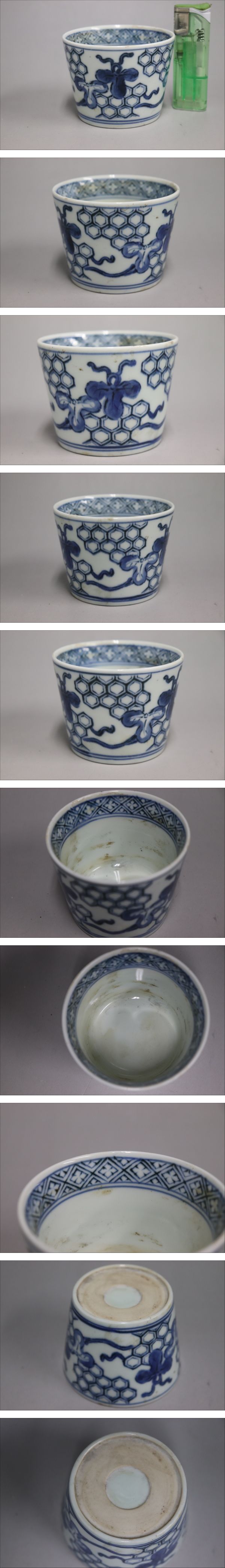 | 商品説明 | 商品名 江戸期 古伊万里染付 亀甲唐草文 蕎麦猪口 付属品:なし。 サイズ:高さ6.2cm、口径8.4cm、底径6.2cm。 状態: 時代のスレはございますが無疵になります。 |
