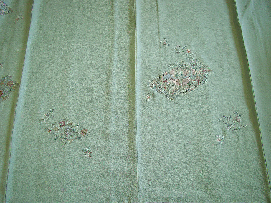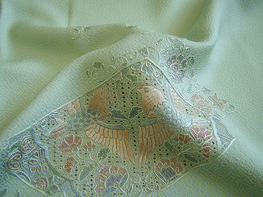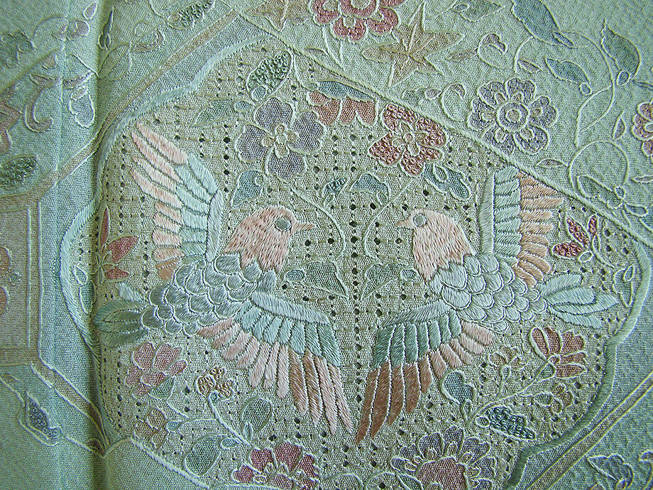 | ちょっと一言 | 大変に極め細やかな極細糸を使用した「蘇州刺繍」は「中国四大刺繍」の一つです。 蘇州刺繍の刺繍糸は極めて細く、最も細い糸は実に髪の毛の十分の一と言われております。 高度な技法により奥行きや立体感のある生き生きとした仕上がりを演出する 神秘的な空間美さえ纏う優美な雰囲気漂う気品に満ち趣溢れる柔らかな彩の素敵な訪問着です。 |