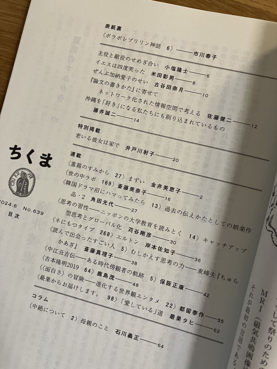【新品】ちくま 2024年6月号 No.639 市川春子 イラスト 角田光代 岸本佐知子 最果タヒ 沖縄 南海トラフ 小説 コラム 雑誌 エッセイ【未読品】レア| 出价者 | 信用 | 价格 | 时间 |