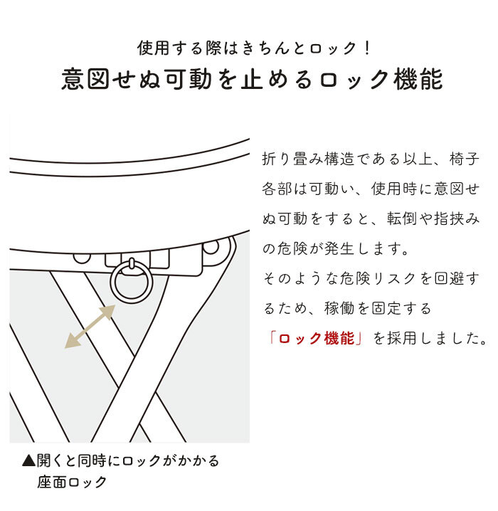 | 張地にこだわり、安全性を重視した折りたたみチェア。 意図せぬ可動を止めるロック機能を採用し、安全に折りたたんでコンパクトに収納ができます。 座面はウレタンを使用することで、長時間座っても疲れにくい仕様になっています。 カラーによって表情の違うツイード調ファブリックを使用しています。 |