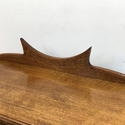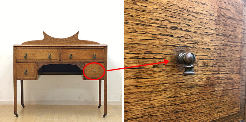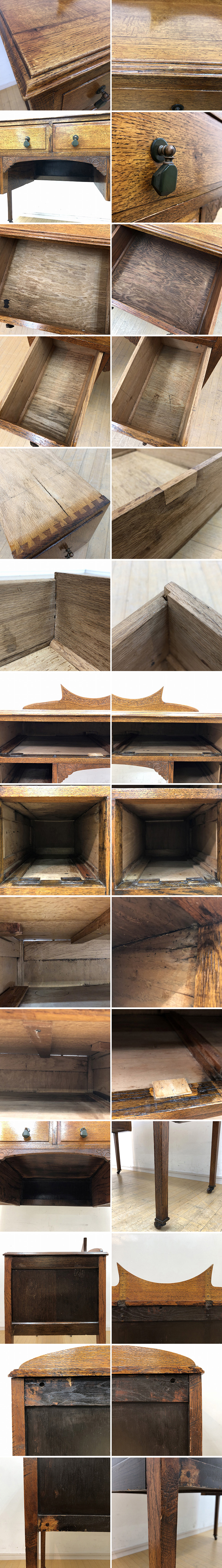 こちらはアンティーク 4ドロワー サイドボード ドレッサー(ミラー無し)です。 中古品です。 クラシカルなデザインが魅力のアンティークサイドボードです。 製造年、製造元などの詳細は不明ですが、永い時を超えて大切に使われてきたことが 感じられる、大変雰囲気の良いお品です。 繊細な飾り彫りが施され、木の温もりの中にも凛とした気品を感じさせてくれます。 元々はミラーが付いていたドレッサーですが、ミラーを外してサイドボードとして 使われていたお品になります。※ミラーは付属しません。 引き出しも4杯備えており、小物の整理などにも便利です。 サイドボードとしてはもちろん、ミラーを合わせてドレッサーとして、 ワークスペースや書斎などでデスクとして、 アンティークならではの深い味わいを活かした店舗什器としてもおすすめです。 この機会にぜひいかがでしょうか。 【コンディションについて】 古いものですので、全体的に経年感やキズ、変色、スレ、塗装の剥がれ、 接合部のゆるみ、隙間、古いにおい等がございます。 ![]() 天板上部の飾り部分の固定にはゆるみがあります。 しっかりと固定してお使いいただくか、取り外してお使いください。 (取り外した場合、天板にネジ穴が開いています) ![]() 引き出しの取手飾りが1箇所欠損しています。 その他詳細は下記画像も合わせてご参照ください。 ![]() 再良市場の他のお品物はこちらから!