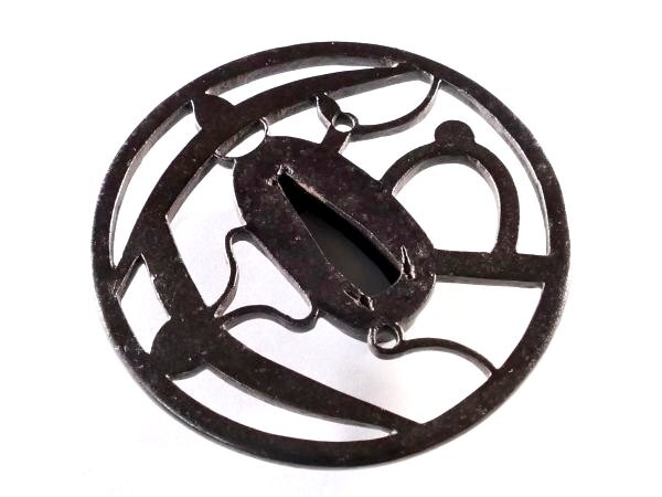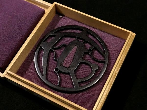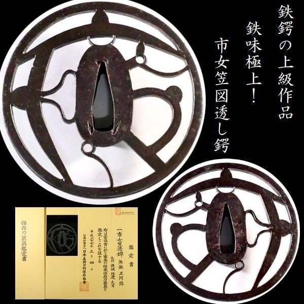 | 商品説明 | ネットリとした極上の鉄地に 大胆な構図の市女笠図が施された これぞ透かし鍔の名作でございます。 鑑定では「正阿弥」と極められておりますが 当方が見る限りでは「赤坂」や「京透かし」等の 名作のように見えます。 いずれにしましても材質・細工ともに 上級クラスの作品であり 透かし鍔の御手本のような一品と存じます。 サイズも大型であり 居合用の拵にも最適と思われます。 この機会に是非手に入れて下さい。 【極上の鉄地】 【大胆な透かし細工】 【保存刀装具鑑定書 付属】 寸法: 約 8.56cm × 約 8.56cm × 約 0.38cm (切羽台の厚み) 重量: 約 85.2グラム 時代: 江戸時代 材質: 鉄地 桐箱付 銘 : 無銘 状態:特に気になる傷みはなく良好。画像にてご判断下さい。 :許容範囲内の時代傷みはご理解下さい。 |