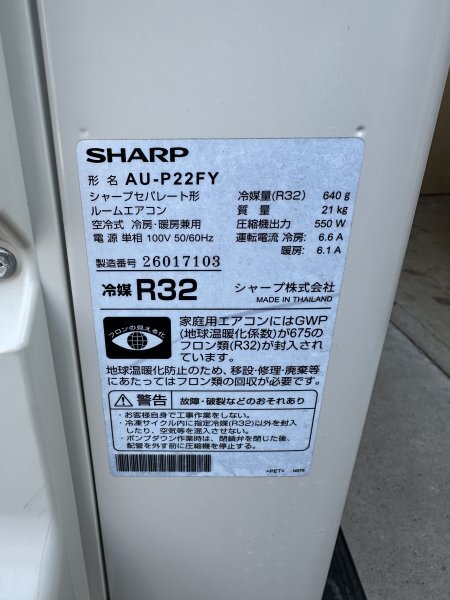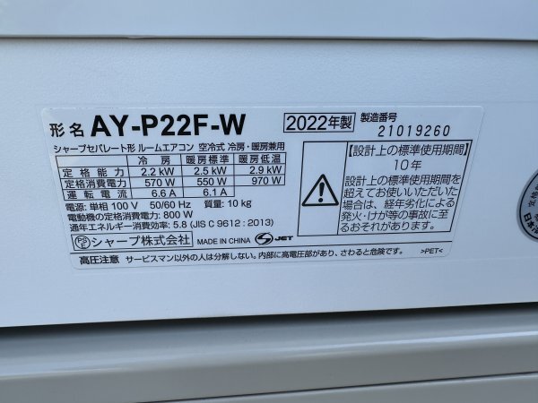 シャープ SHARP 2022年 2.2kw 6畳用 冷暖房 ルームエアコン AY-P22F プラズマクラスター 自動フィルター清掃 ①です。