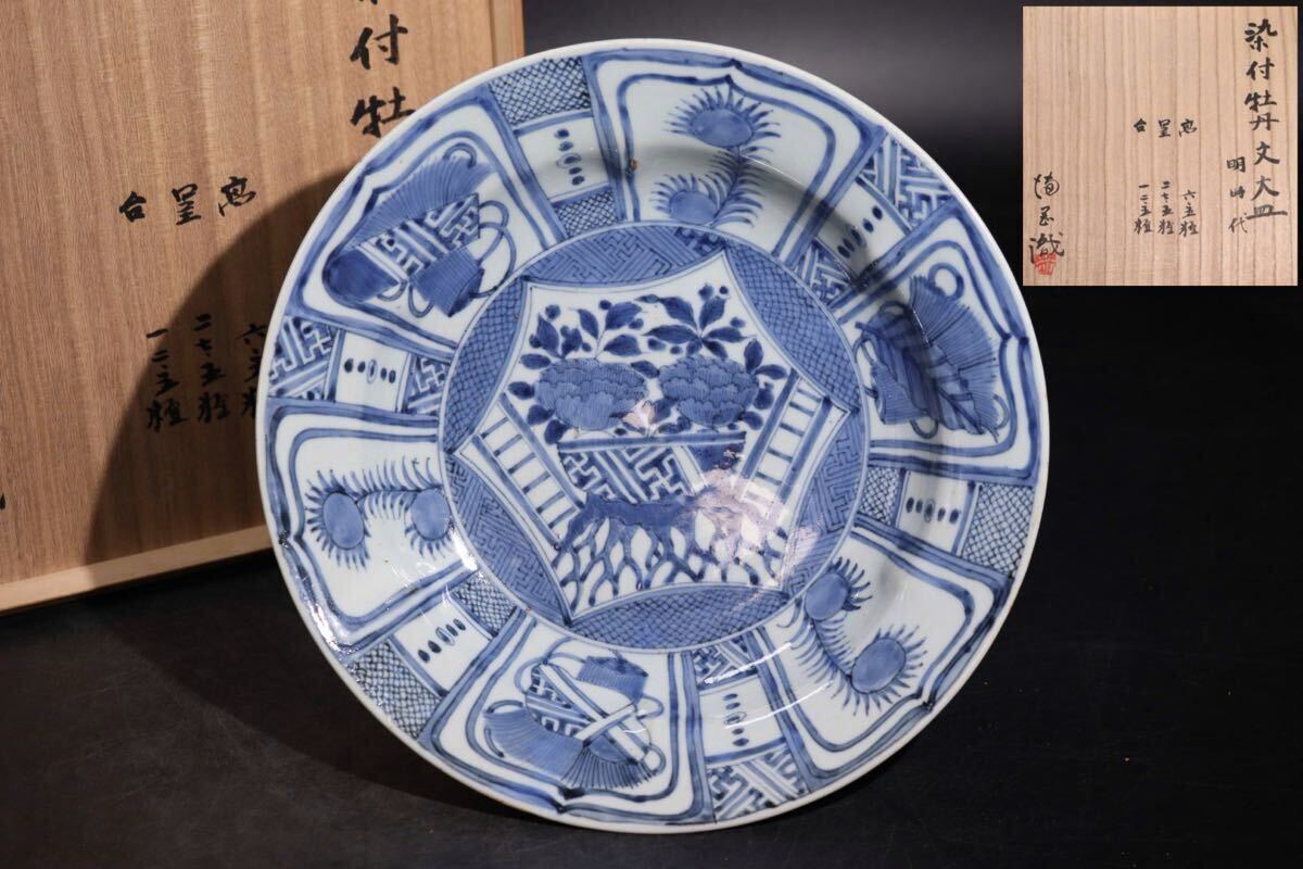 | 満岡忠成 識箱 「 染付 牡丹文 大皿 明 時代 」 / 明 古染付 中国美術 芙蓉手 皿 茶器 煎茶道具 .G2473 |