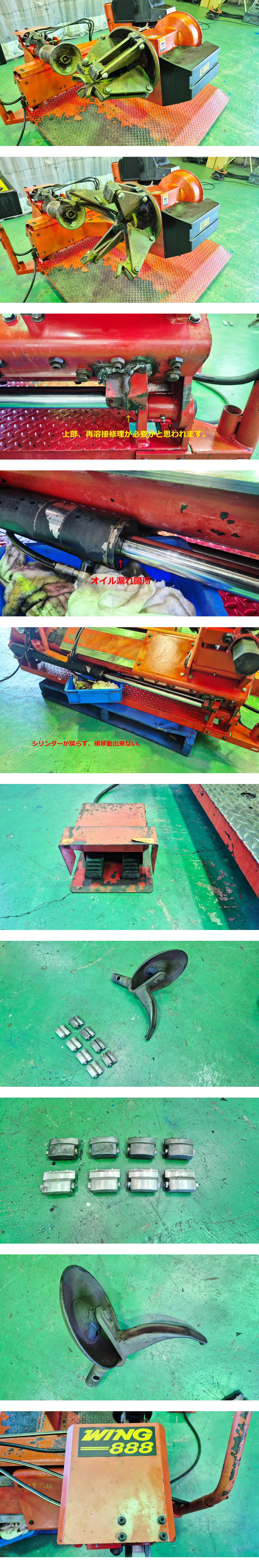 ■メーカー エイワ ■型式 WING888 ■仕様 電源 三相 200V 油圧ポンプモーター 2.2kw(3HP) タイヤ回転モーター 2.2kw(3HP) 適応ホイールサイズ 14~26インチ 最大タイヤ径 1600mm 最大タイヤ幅 700mm 本体寸法 MIN 990mm(高)×1700mm(幅)×1450mm(奥行) MAX 1180mm(高)×2200mm(幅)×1750mm(奥行) 本体重量 670kg オプションパーツ マウント・デマウントツール メーカーカタログ TB/LTタイヤチェンジャー エイワ・WING888 ■状態 ※動作確認は行っておりますが、下記内容によりジャンク扱い、要修理品での出品となります。 ・横移動シリンダーよりオイル漏れ有り(画像参照) ・横移動シリンダーが戻らない為、横移動が出来ません。 ・横移動シリンダーを固定している土台を、再溶接修理する必要があるかと思われます。(画像参照) ・チューブレスローラーのシリンダーに曲がり箇所がございますが、今の所、使用には問題無さそうです。 上記をご確認の上、ご入札をお願い致します。 ※中古品の為、さび・傷・汚れ・カバーの割れ・曲がり等はございます。 ご理解の上、ご入札をお願い致します。 ■付属品 ※画像に写っているものが全てです。 ■備考 ※直接のお引取り対応可能です。(積込み可能な車両でお越し下さい。) |