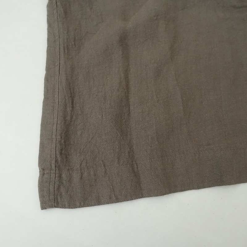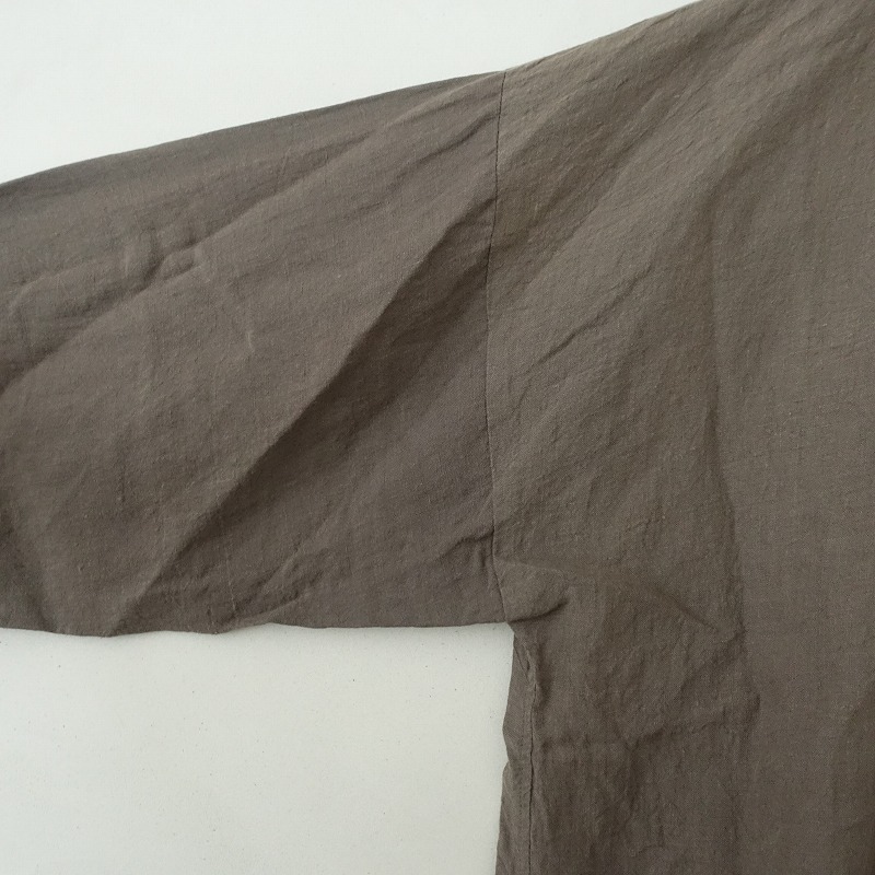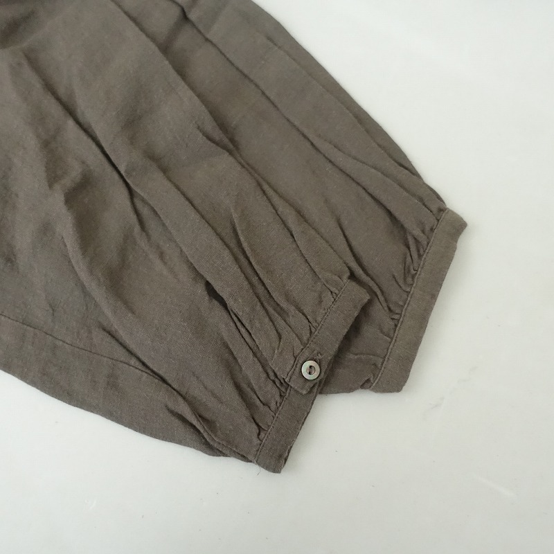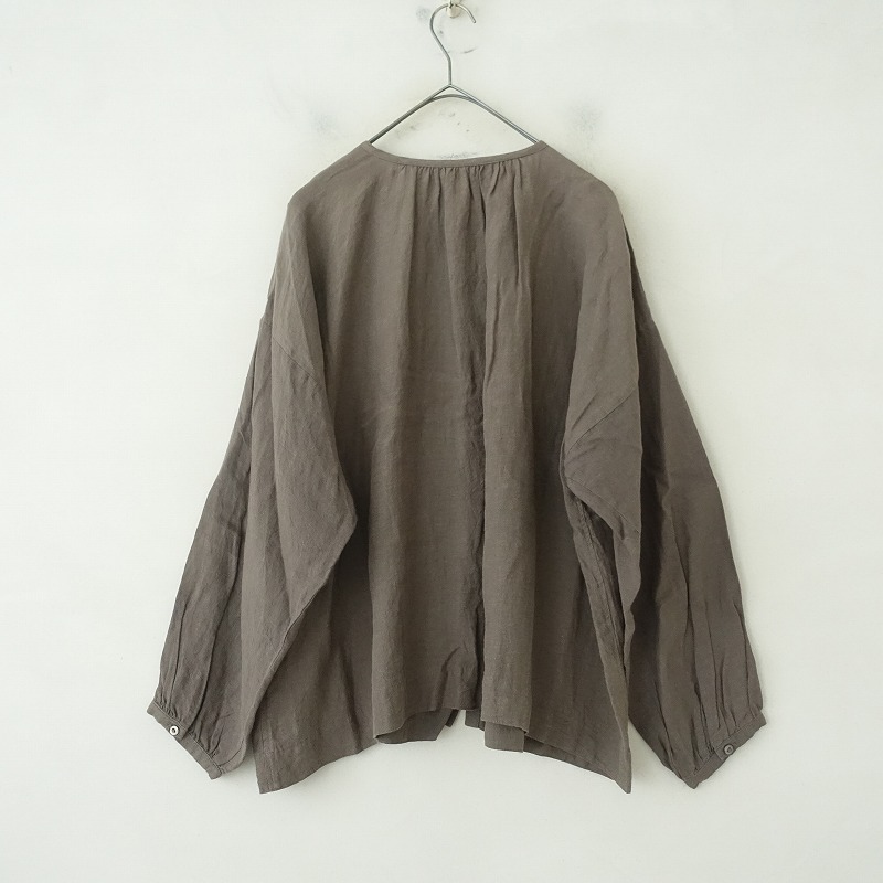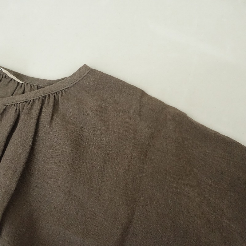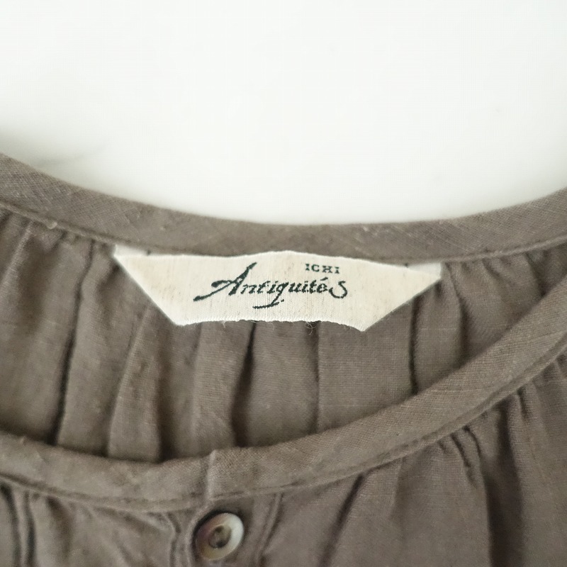 | ICHI Antiquite’sのリネンギャザーブラウスです。カラーは薄めのダークブラウン系で、薄手リネン地で仕立てられております。ネック部にギャザー入りで、ややゆったりとしたシルエットになっており、フロントボタン開閉で着脱できます。 |