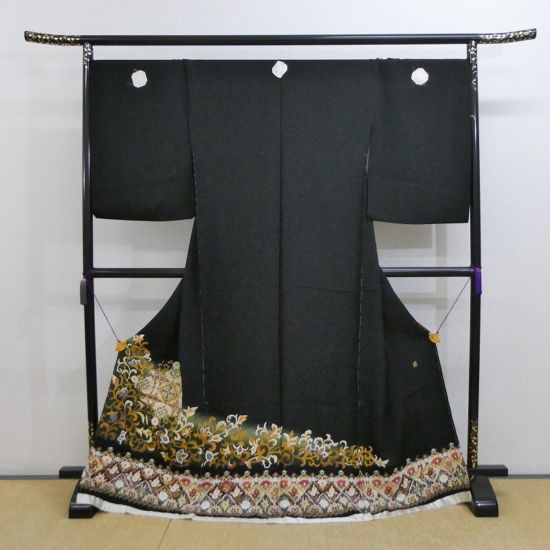 ◆黒留袖/作家物/丹後ちりめん/花柄等/新品/未仕立て/正絹/絵羽/(梱包サイズ:80)◆* コメント・全体的に薄汚れ・薄い色ヤケがあります。 ・新品ですが、経年保存されていたお品ですので、ご理解のある方のご入札をお願い致します。 ・絵羽(仮縫い状態)ですので、着用にはお仕立てが必要です。当店でもお仕立てを受け賜わっております。お仕立代はこちらを参照してください⇒http://marubun.stars.ne.jp/sitate.jpg また、ご不明な点(納期等)はご落札前に質問をして下さい。宜しくお願い致します。 ・ ・ * 品質・サイズ -- 着物サイズ目安 -- ・身丈・約167cm、袖丈・約60cm、裄・約69cm ・五つ紋:石持ち ・ ・※一部商品のみのお取引はお断り致しております。入札前・落札後に一部の商品のみのお取引交渉や発送方法(メール便等利用)の交渉はご遠慮下さい。サイズ・発送詳細を必ずご確認のうえ、ご理解・ご納得のうえでのご入札をお願い致します。 ・梱包サイズ:80サイズ(発送詳細必読) * 程度 当社基準ランク・・・【4】