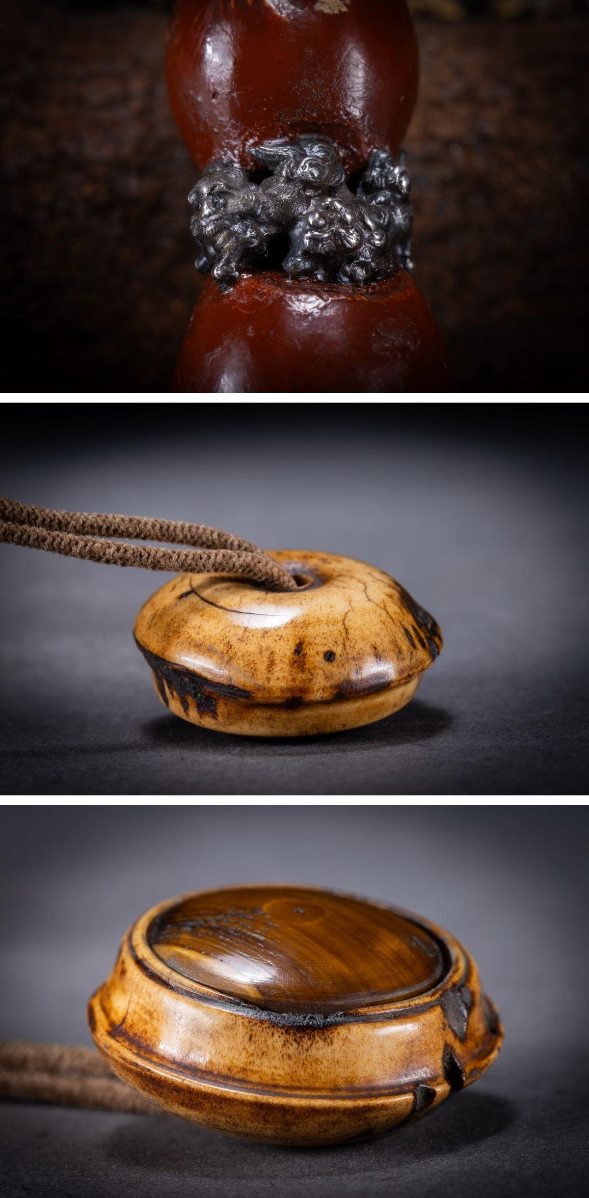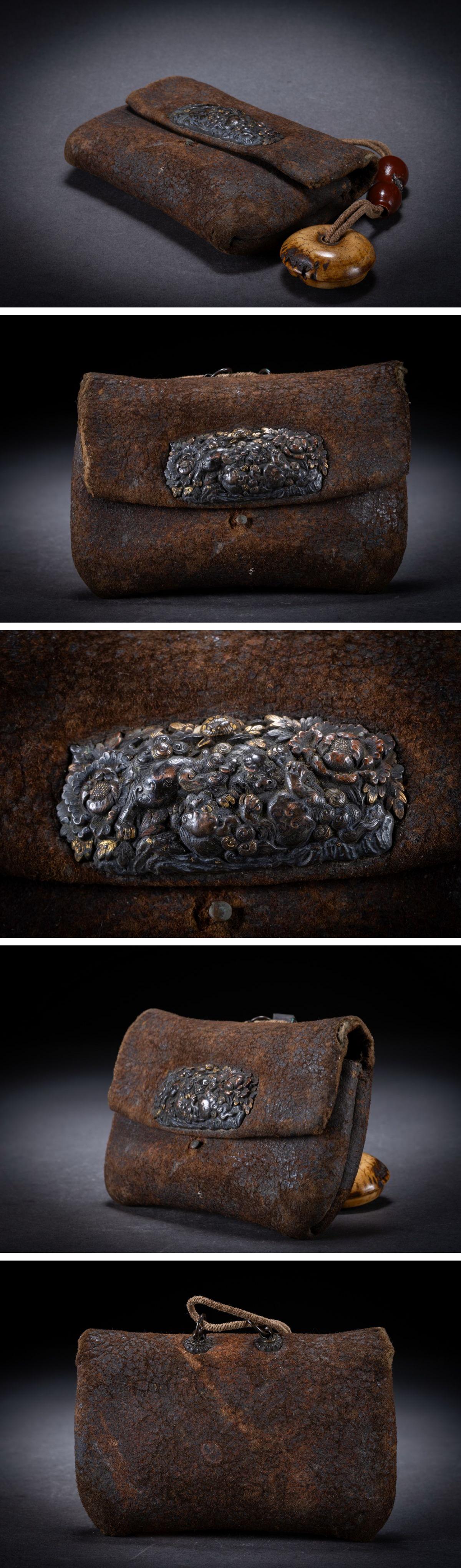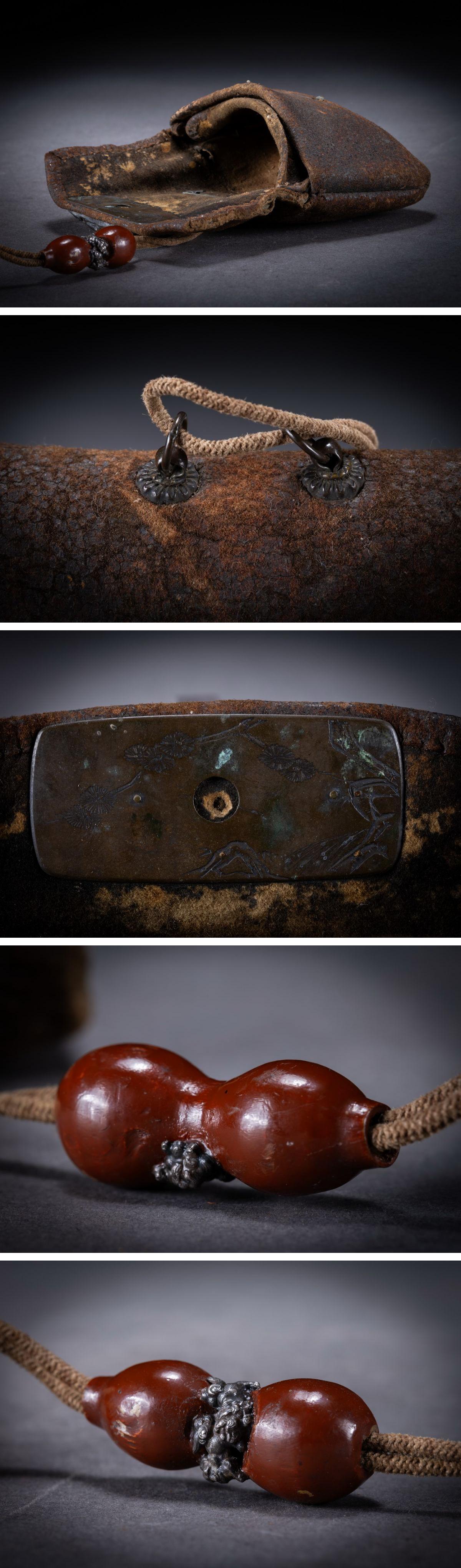 【華】時代舊藏 江戸時代 金唐革煙草入り 瓢箪文緒替玉 鏡蓋根付 時代物 古美術 骨董品A25070236-RQ