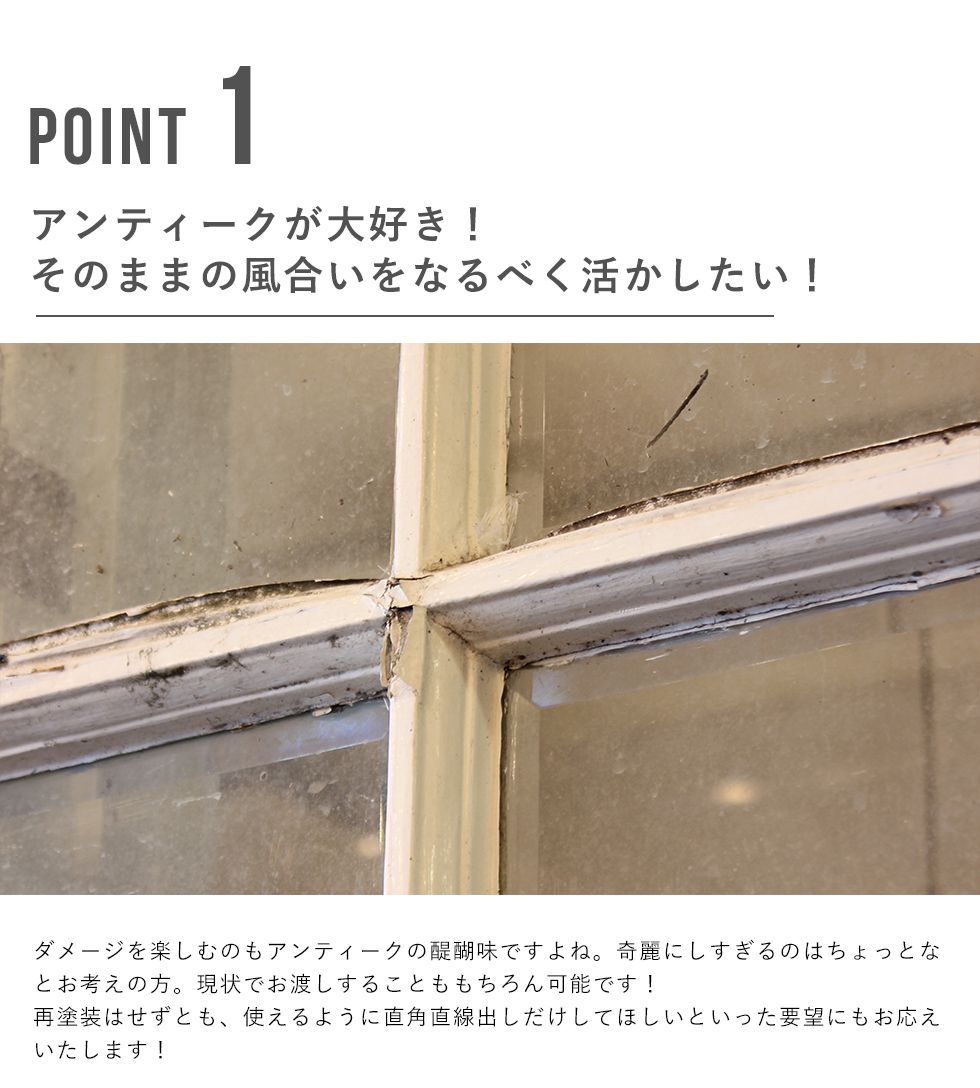 イギリス、フランスを中心にヨーロッパ中から直接買い付けをした本場のアンティーク品となります。 高級なイメージのアンティークですが、当店ではリーズナブルにアンティークをお楽しみい頂けるよう、ステンドグラスは一度に1,000枚以上。アンティークドアも100枚以上を一度に輸入。 全国でも有数の買い付け量を誇ります。 創業以来現在の買い付け量を保つ事で、現地ディーラーとの密な信頼関係を構築。当社に向けてより良い物を提供してもらえる環境作りを維持し、現在では現地取引先約20社と提携しています。 また当店ではアンティークのプロフェッショナルが常駐する工房を完備。修理、メンテナンスはもちろん、ステンドグラス、ドアの制作からカスタムまで、アンティークのご相談はウェリントンにお任せください。 ネットに載っていない商品もまだまだございます。京都伏見のショールームにも是非お越しくださいませ。 ※修理に関するご注意※ ■ 標準修理に関しては別途料金にて承ります。事前に仕上がりサイズを必ずご確認くださいませ。 ■ 標準修理をご依頼の場合、決済確認後の着手となります。恐れ入りますが代引きでのご決済はお断りしております。 |