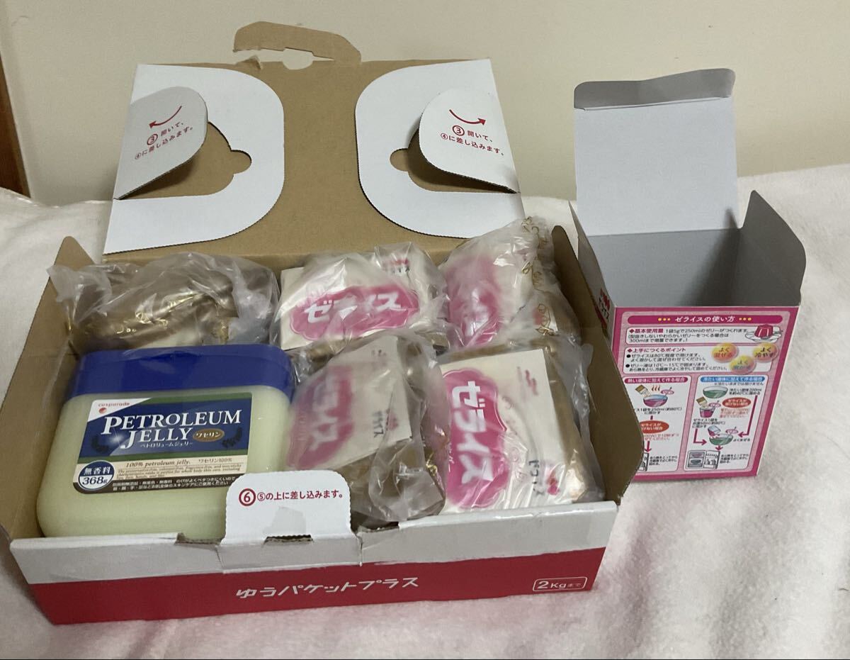 実は出品のもう1つの目的は、ワセリン以外で私が今のところ使い道のない、ゆうパケットプラスの箱の在庫(7枚)を少しでも使って減らしたい事情もあります。