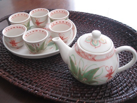 | 商品説明 | ベトナムの伝統工芸「バッチャン焼き」 (急須1個、茶杯6個、丸皿1枚) インテリアとして楽しむもよし、お茶を入れて癒しの時間をゆっくり楽しむもよし。 しばし、ベトナムへタイムスリップ。 菊柄は長寿を表し、とんぼ柄は幸運をもたらすと言われています。 |