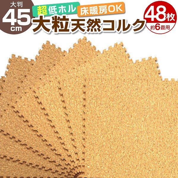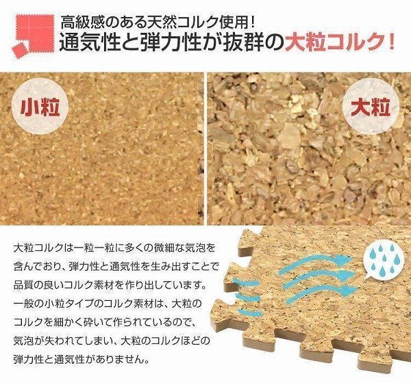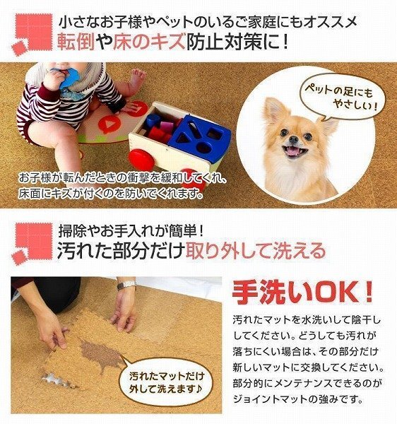 高品質の大粒コルクを使用したジョイントマットです。 コルクは、肌触りが良く、夏は涼しく、冬は保温効果を発揮するので、 フローリングでつるつる滑って歩きにくかった犬や猫にも大評判! ホットカーペット・床暖房対応! さらに、ノンホルムアルデヒド仕様なので小さなお子様にも安心! レイアウト自在なジョイント式で、カッターで簡単に切れるので 様々なスペースに合わせることができます。 また、大量の窒素が含まれている為、燃えにくいので火にも強いのがコルクです。 汚れた部分は取り外して水洗いが出来てカンタンお手入れ♪ 裏面はクッション性のあるEVA素材。 音や振動を低減します。 嬉しいサイドパーツ付き!壁ぎわに敷いても、隙間なくキレイに。 掃除がラクラク! |