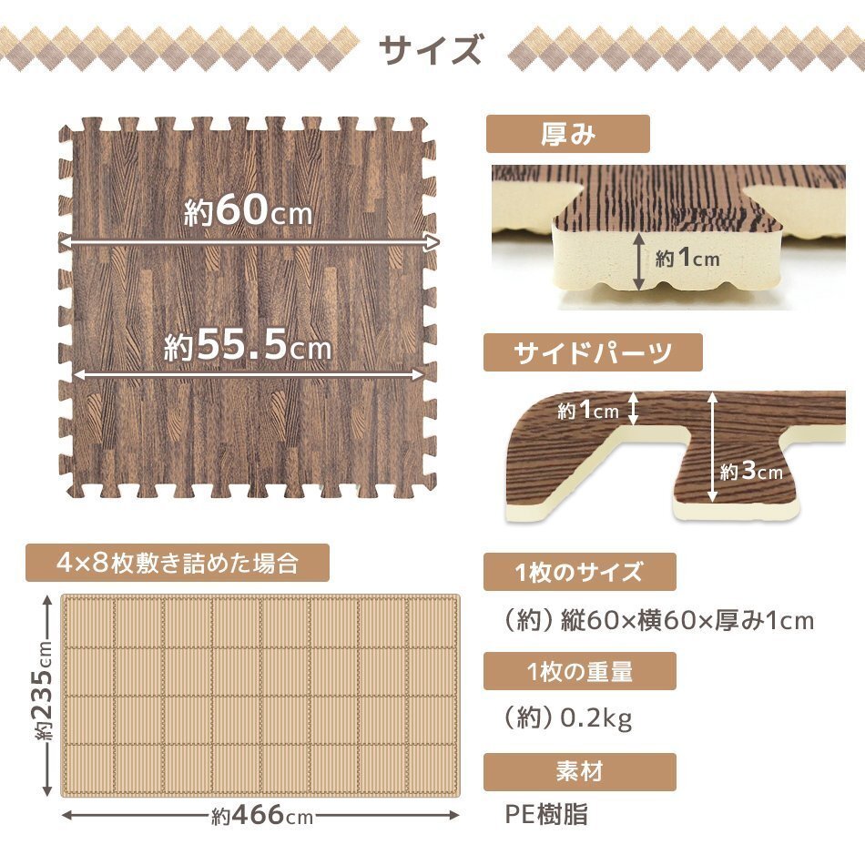 | 60cm 大判 ジョイントマットです。 カッターやはさみで簡単に切れるのでレイアウト自由自在! 足音をやわらげてくれるので、子供部屋やフローリングのお部屋に最適です! 適度なクッション性が転倒時に衝撃を和らげてくれます! 冬は床下からの冷気をカット! 夏は冷房による温度を効率よく保ちます。 汚れた部分は取り外して水洗いが出来てカンタンお手入れ♪ 嬉しい!サイドパーツ付き! 壁ぎわに敷いても、隙間なくキレイに。 掃除がラクラク!! 自然をイメージした木目デザイン! お部屋に落ち着いた雰囲気を与えてくれます! 【商品仕様】 カラー:ブラック サイズ(約):幅60×奥行60×厚み1.0cm(※1枚) (設置目安サイズ(約):121×121cm(正方形)) 素材:PE素材 【商品内容】 ジョイントマット 16枚 サイドパーツ(角付きパーツ16本、角なしパーツ16本) ※床材との温度差で製品が反る場合があります ※入荷時期によって厚みや幅に多少の誤差がある場合がございます ※商品はモニターによって色合いが異なって見える場合があります (マット 木目 木目柄 WEIMALL WEIWEIホールディングス) |