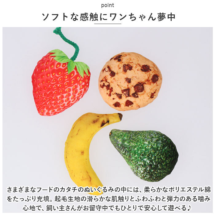 | 商品説明 | ・・ポップ&カラフルなおやつを本物そっくりに再現!キュキュッと音が鳴って楽しい「ペット用おもちゃ(ドッグ用)」が新登場。 ・【楽しく遊んで、ストレス解消】 ・手のひらサイズのぬいぐるみに、クッキーやソフトクリーム・フルーツのイラストを色鮮やかにプリント!優しく噛んだり、投げたり、つついたり・・・楽しく遊んでストレス解消に役立つユニークなドッグ・トイ。 ・【ソフトな感触にワンちゃん夢中】 ・さまざまなフードのカタチのぬいぐるみの中には、柔らかなポリエステル綿をたっぷり充填。起毛生地の滑らかな肌触りとふわふわと弾力のある噛み心地で、飼い主さんがお留守中でもひとりで安心して遊べる♪ ・【キュキュッと可愛い音が鳴る♪】 ・ぬいぐるみの中には、音が鳴って楽しい「鳴き笛」付き。ワンちゃんが軽くくわえたり、踏んだりするたびに「キュキュッ」と可愛いらしい声で鳴くよ♪ ・【ネコ大興奮!マタタビパック付き】 ・ぬいぐるみの中に縫い込んだ「マタタビパック」に大興奮!ネコちゃんの興味が持続し、飽きずに遊んでくれるのでキャット用トイにしてもOK!(※マタタビをワンちゃんに与えても、ネコのようには強く反応しないことがほとんどです。※マタタビパックは取り出せません。) ・【噛みキズ予防、運動不足対策にも】 ・めいっぱい楽しく遊んでペットのストレスを和らげることで、ソファや家具などへの噛みキズ予防にも効果的!運動不足で太り気味のワンちゃん・ネコちゃんにもオススメ。 ・【ペットライフが充実!】 ・ペットと一緒に遊んでコミュニケーションを取りたい時や、愛犬・愛猫とのポートレート撮影の小道具にもピッタリ。ペット系ユーチューバーさんの撮影グッズとしても大活躍♪ |
