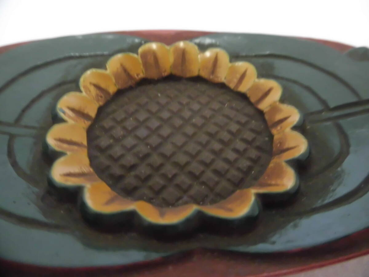 | 品名:草華紋色漆仕上小判茶托 五枚一組 煎茶道具 作家:桃石作 寸法:≒12x6.3㎝ 内糸底径≒3.5㎝(滑り止彫入り) 状態:表面は碧色、黄色、朱色の三色の漆塗に菰(こも)を打ち込んだ逸品です。 裏面は朱色で仕上げました。 できるだけ説明いたしますが、写真でご判断ください。写真の色の誤差はご容赦ください 出品者の主観です:彫漆とも相当の時間をかけて制作したくす材を使った力作です。 | ||