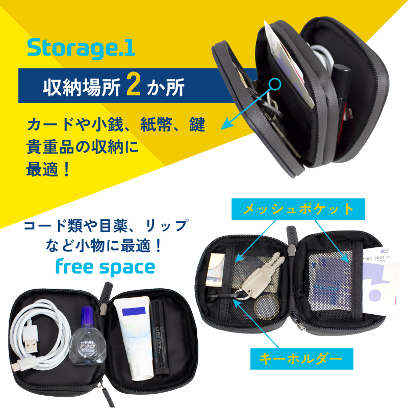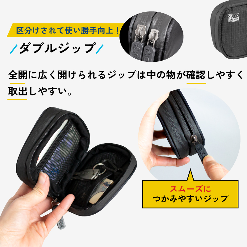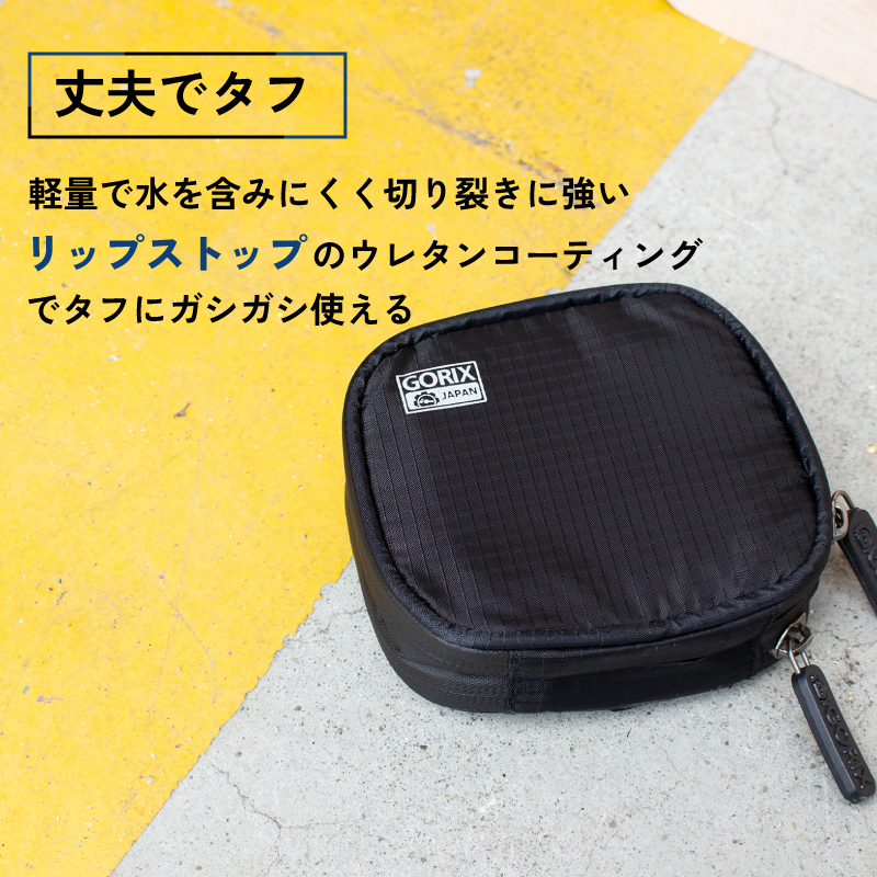 ダブルファスナーで収納箇所か2か所あるミニポーチ。 収納場所が2か所あるので入れる物の仕分けができます。 通常のポーチよりコンパクトにした事で携帯性がアップ、カバンの中に入れても場所をとらない。 スポーツやアウトドア、ビジネス、旅行など自由な使い方で幅広くお使い頂けます。 カードや小銭、紙幣、鍵、コード類など散らばりがちな小物の整理に活躍します。 また切り裂きに強いリップストップのウレタンコーティングでタフでガシガシ使える。 そして汗や雨に強いのでとても安心です。 サイクリング時にバックポケットに入れておくと便利なコンパクト財布。 デイリーに持ち歩く小物ケースとしておすすめします。 [収納場所2か所] 収納場所は2か所に分けられているので貴重品と小物など必要に応じて仕分けできる。 1か所は両サイドにメッシュポケットとキーホルダーが備えついているのでカードや鍵、小銭、紙幣の収納に最適です。 別サイドの収納場所はフリーになっているので自由な使い方ができる。 コード類やイヤホン、サプリメントや飴、ミントタブレット、ポケットティッシュなどが入る小ぶりなサイズ [ダブルジップ] 全開に広く開けられるジップは中の物がみやすく取出しやすい。 また防水ジッパーなのでジップ付近からの侵入をカット。 [丈夫でタフ] 軽量で水を含みにくく切り裂きに強いリップストップのウレタンコーティングでタフにガシガシ使える。 毎日使いでも心配いりません。 [コンパクトサイズ] 携帯性に優れたミニサイズ。サイクルジャージの背中ポケットにもすっぽり入ります。 また登山やキャンプ時でもザックの中に入れても邪魔にならない。 旅行やビジネスのシーンでも小物収納ポーチとしてかばんにしまっておけます。 [様々なシーンで] サイクリングだけでなくランニングやウォーキング、釣り、登山や旅行、ビジネスなどの様々なシーンで自由な使い方で幅広くお使い頂けます。 材質表面ripstopリップストップ生地、裏ナイロン生地 ※防水ファスナー(完全防水ではありません) サイズ10×11cm 厚み約3cm ・商品は入荷によりキズがある場合があります。 保証対象外になりますのでご了承お願い致します。 ・ディスプレイ環境により実物と色が異なる場合が有ります。 ・入荷時期により予告無く一部仕様変更する場合が有ります。 | |
