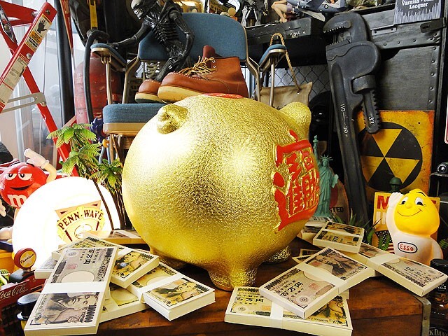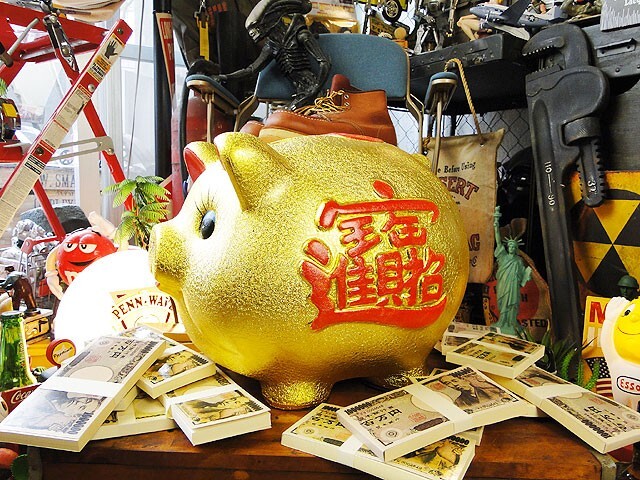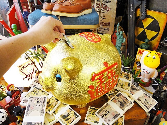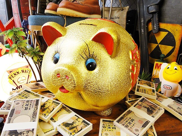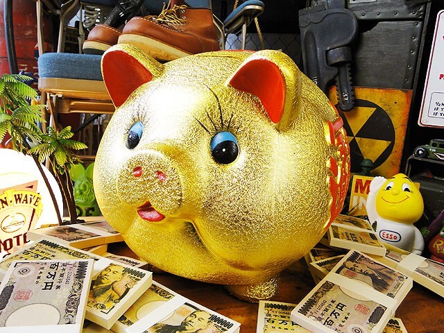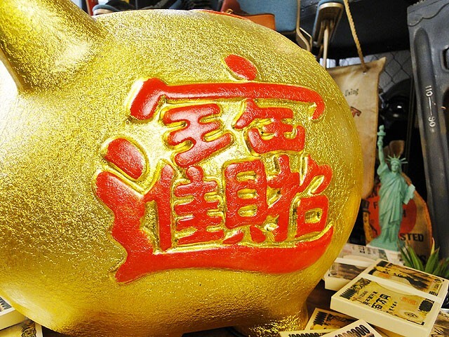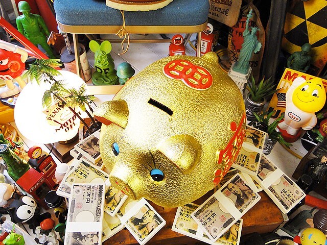 金運、財運を招くと言われる縁起の良いブタ、金のブタの貯金箱です。