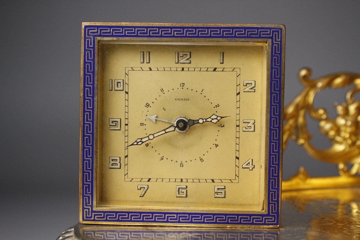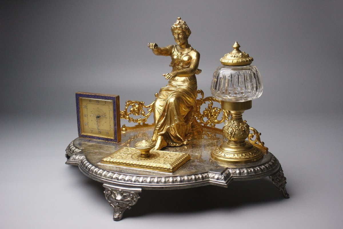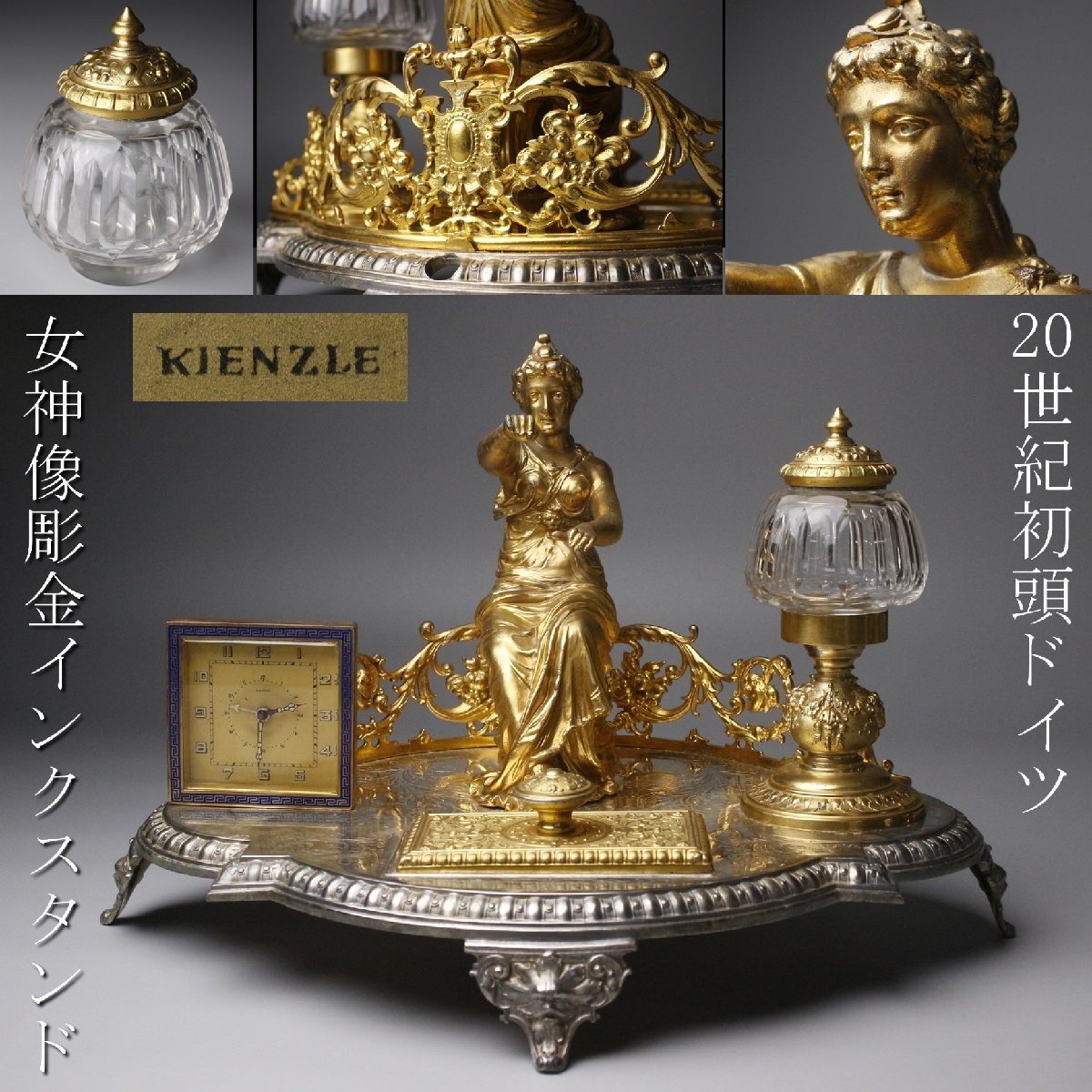 【LIG】20世紀初頭 ドイツ 女神像 彫金インクスタンド KIENZLE キンツレ 時計付 細密造 アンティーク [.YQ]25.11
