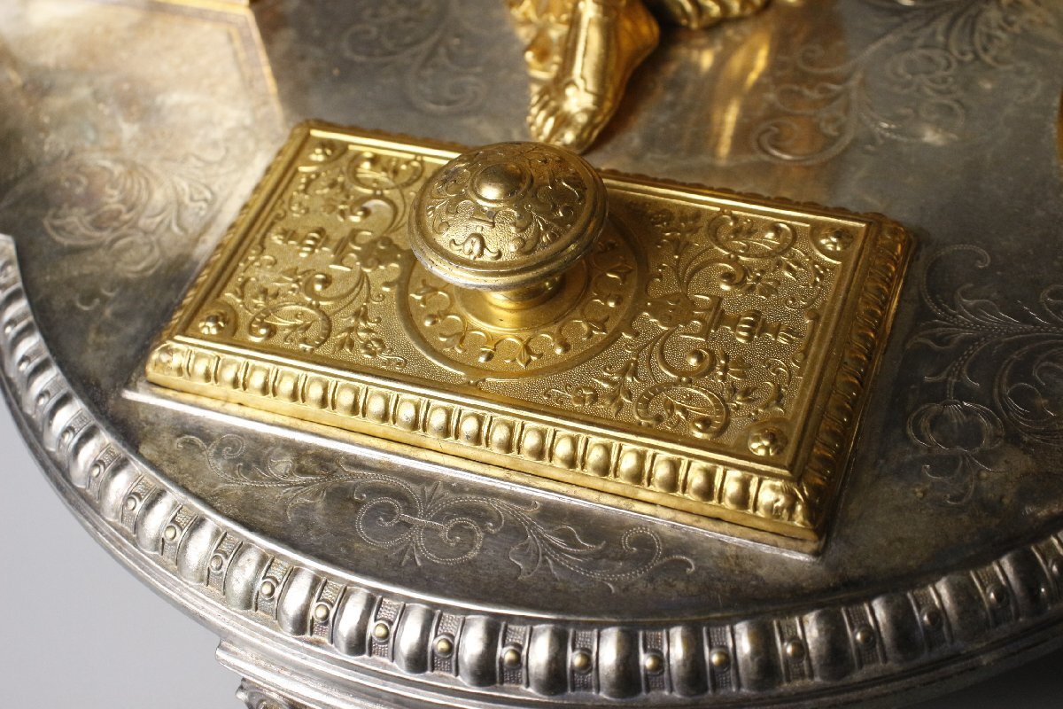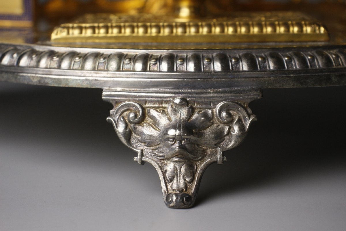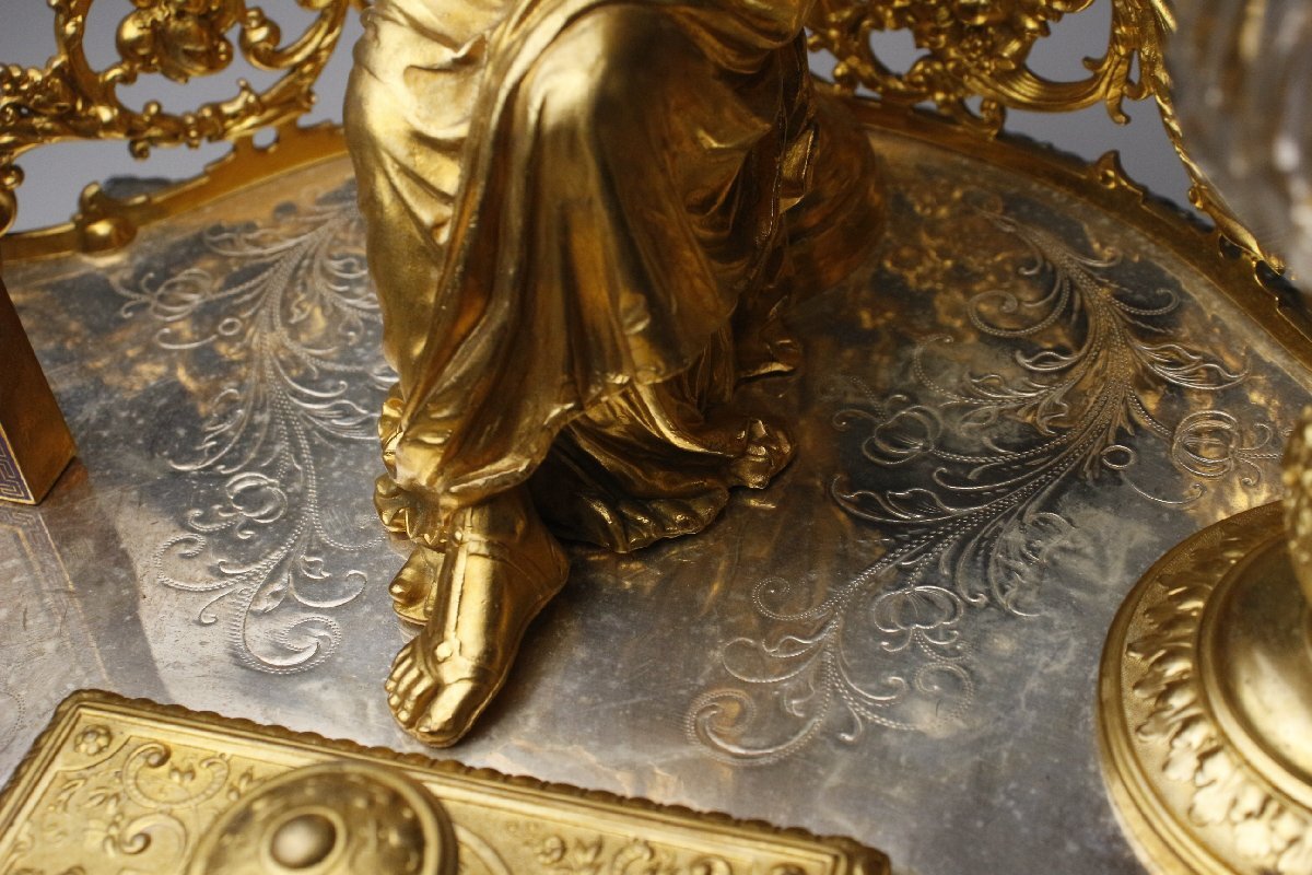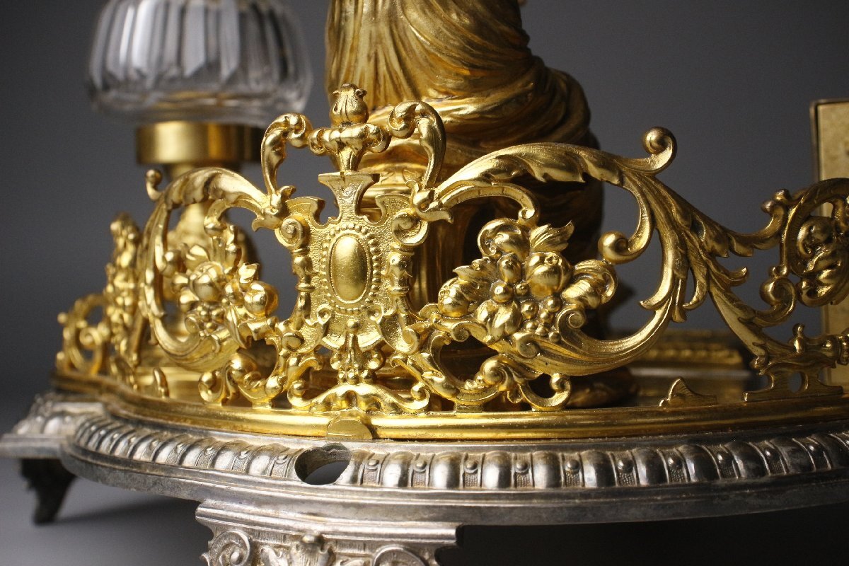 【LIG】20世紀初頭 ドイツ 女神像 彫金インクスタンド KIENZLE キンツレ 時計付 細密造 アンティーク [.YQ]25.11
