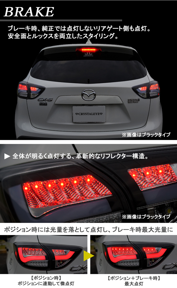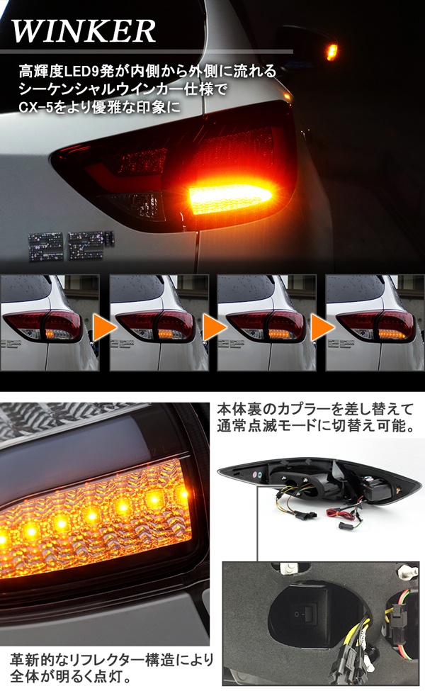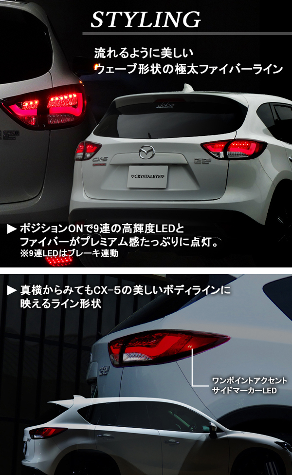 商品番号:S197RS 車種:CX-5 商品名:LEDテール カラー:レッドスモーク ※落札後のカラー変更はご対応致しかねますので ご入札前に必ずカラーをご確認下さい。 ▼ 商品説明 マツダ MAZDA CX-5 ファイバーLEDテールV2 流れるシーケンシャルウインカー 【レッドスモークタイプ】 ■デザイン ポジション点灯で極太のファイバーが存在感たっぷりにCX-5のリアビューを スポーティーかつ優雅に演出するプレミアム感あふれる LEDテールです。 サイド面のリフレクターにLEDサイドマーカーが内蔵されており、 非点灯時はLEDが見えませんが、ポジション点灯時に光が浮かぶ上がるのも サイド面のワンポイントドレスアップとして存在感を強調します。 ■ウインカー 高輝度LED9発が内側から外側に流れるシーケンシャルウインカー仕様で 高級感がさらにアップ。 独特なリフレクター構造により全体が明るく点灯します。 テールランプ本体裏にスイッチがついておりますので 通常点滅に切り替えも可能。 ▼対応車種 マツダ CX-5 オールモデル (2017年2月までのCX-5すべてのグレード、前期/後期モデルに対応) ![]()