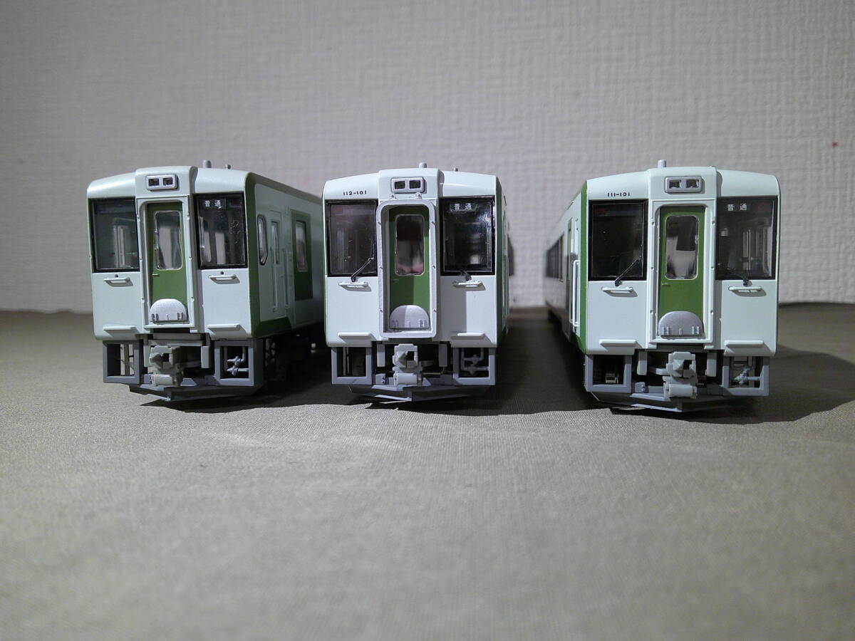 {キハ110-100番(モーター車)}+{キハ111-100番(モーター車)+キハ112-100番(トレーラー車)}以上の3両です。
