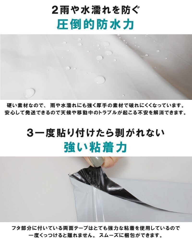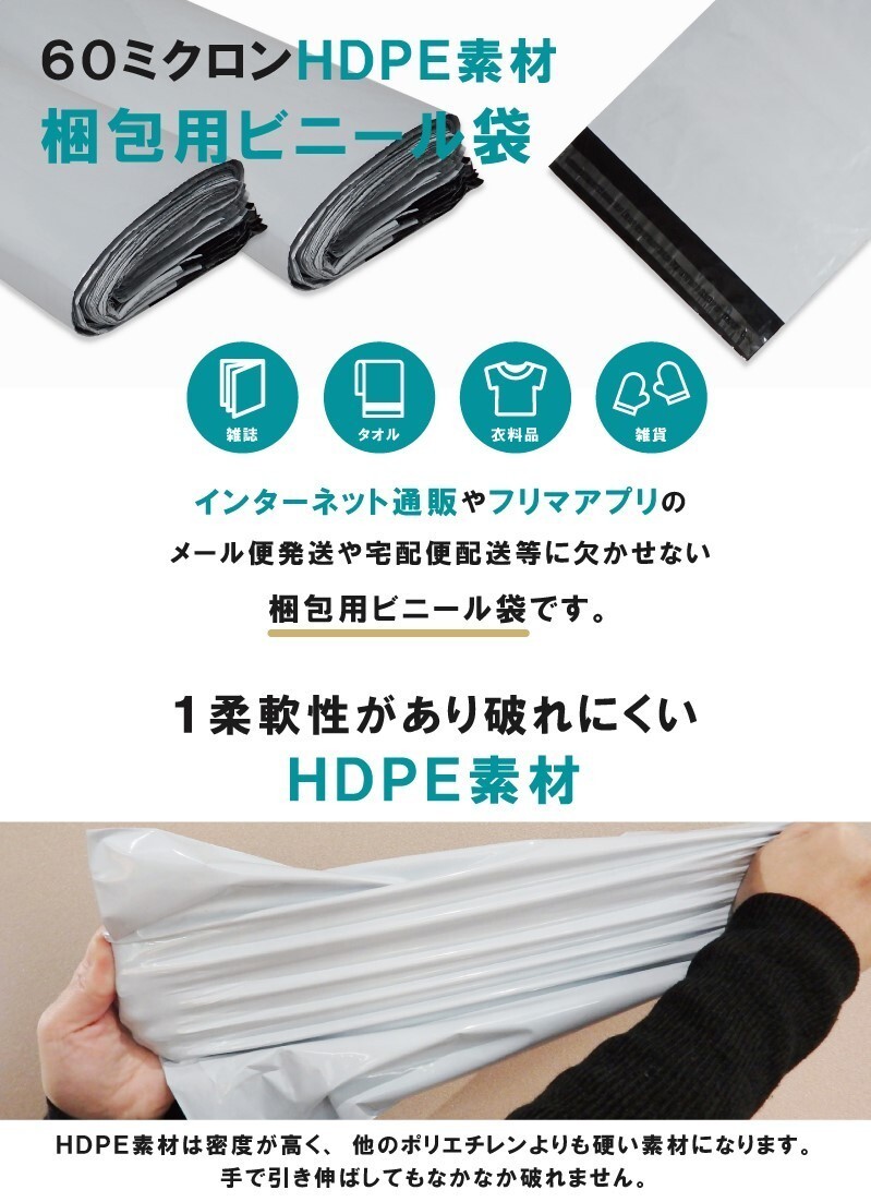 通信販売、フリマアプリのメール便発送や宅配便配送の梱包資材に欠かせないビニール袋です。 HDPE素材は密度が高く、他のポリエチレンよりも硬い素材になりますので、雨や水濡れにも強く厚手の素材で破れにくくなっています。 透明度も低いので中身が見えづらくなっているのも特徴です。 フタ部分に付いている両面テープはとても強力な粘着を使用しているので、 一度くっつけると離れません。簡単に梱包ができます。 また衝撃などにも非常に強く、手で引き伸ばしてもなかなか破れません。 荷物を安心して運べるので、天候や移動中のトラブルが起こる不安を解消できます。 ――――― おすすめポイント ――――― ・高品質で安価な価格設定 ・水や空気を通さない ・ほかのビニール素材と比べると臭気が低い ・着色されているのでプライバシーが守られる ・衝撃や引っ張りにとても強い ・熱や冷気に強い ――――― その他のサイズはこちら ――――― 【A4すっぽりサイズ】250mm×330mm+フタ40mm 100枚 【A4すっぽりサイズ】250mm×330mm+フタ40mm 500枚 【A4大き目すっぽりサイズ】280mm×380mm+40mm 100枚 【A4大き目すっぽりサイズ】280mm×380mm+40mm 500枚 【B5すっぽりサイズ】200mm×260mm+フタ40mm 100枚 【B5すっぽりサイズ】200mm×260mm+フタ40mm 500枚