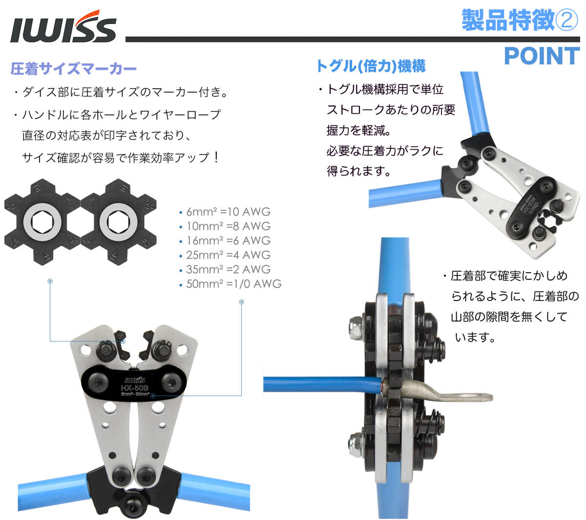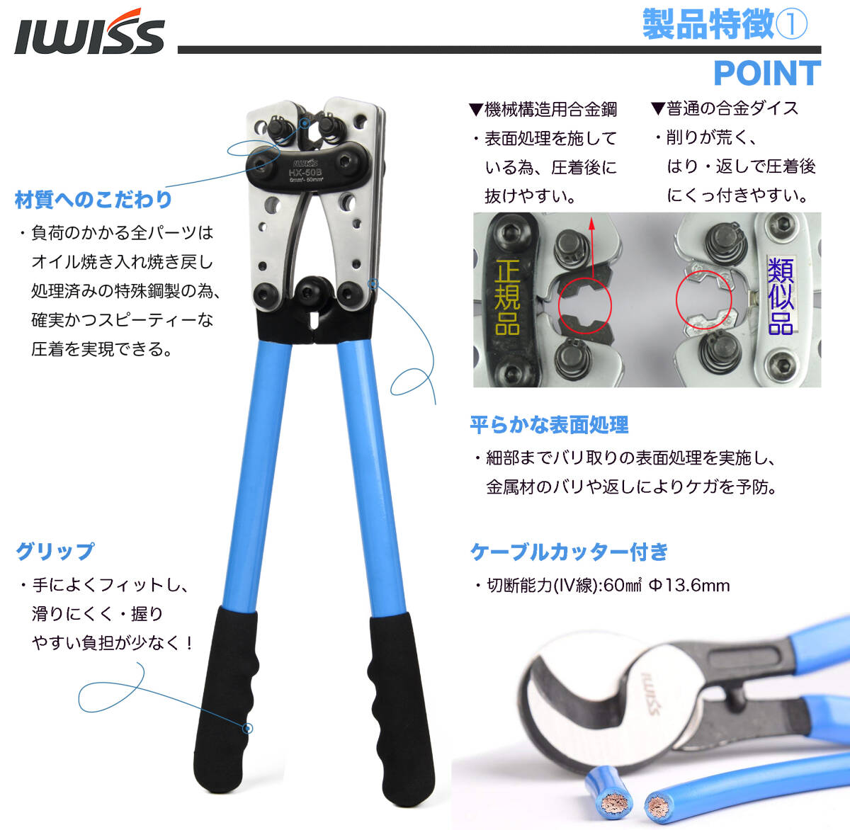 ★☆正規品☆ アイウィス(IWISS) 裸圧着スリーブ バッテリーターミナル 圧着工具 ケーブルハンディカッター付き 5.5-60sq対応 HX-50BI★ | |||
