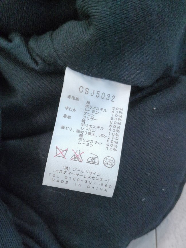 | 材質 | 三者混クロス(綿50%・ポリエステル40%・レーヨン10%) 中綿素材:ダウン80%・フェザー20% |