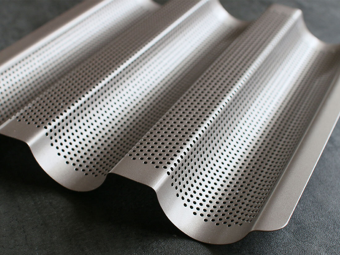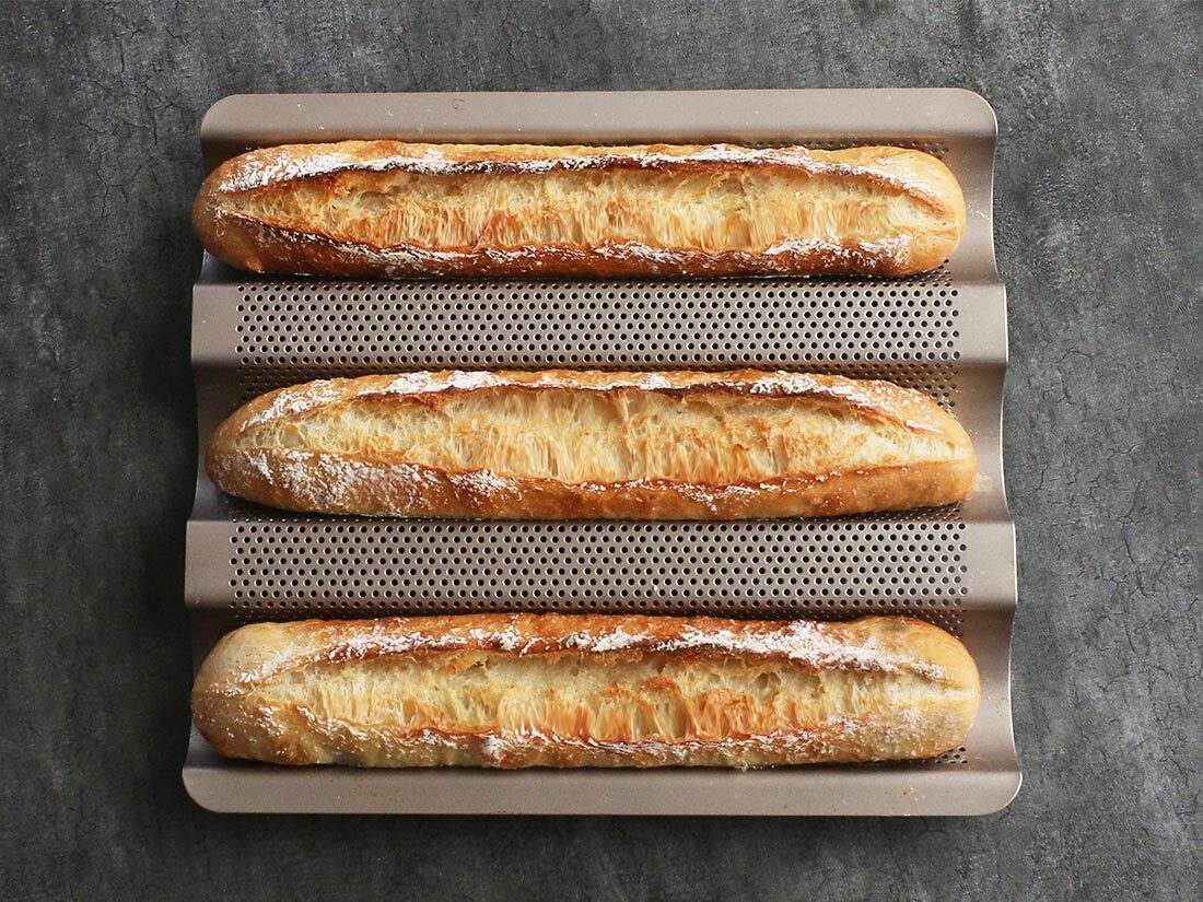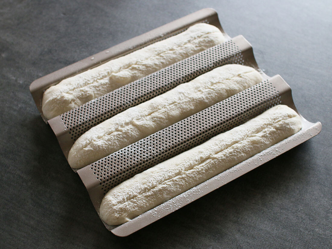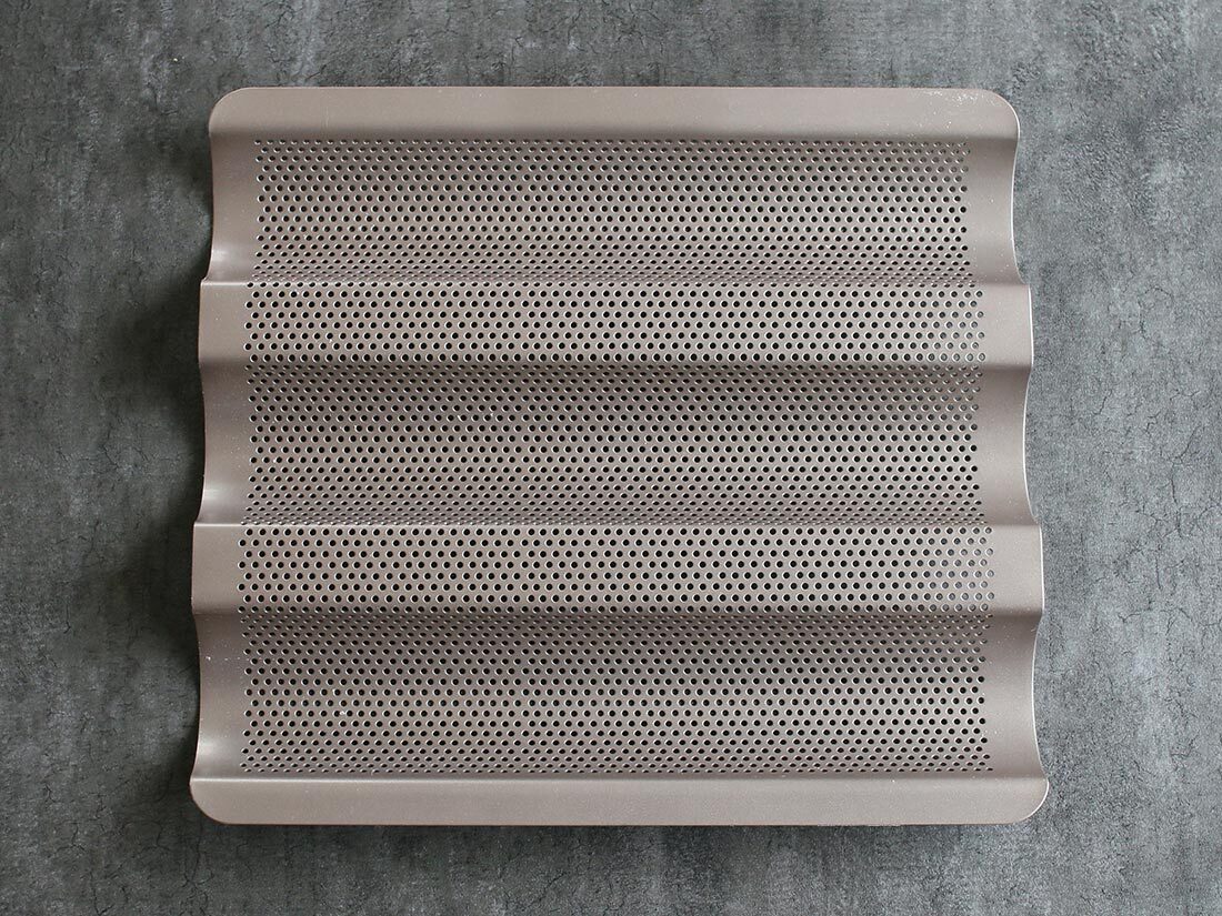 | フランスパン用天板 小 バゲットが簡単に焼けるフランスパン用天板 おうちでバゲットがパリッと焼ける、フランスパン用天板。 おうちパン焼きで難易度の高いバゲット。 バゲットを美しくおいしく焼いてみたい!でも難しそうだし、大変そう…と思っている方も多いと思います。そんな方におすすめなのがフランスパン用天板。この天板を使って、あなたも簡単にバゲットを焼いてみませんか? 成型から焼成までこの1枚で完結! フランスパン用天板小では粉量250gで3分割程度の生地量が焼けます。 このフランスパン用天板を使う事で、ハードパンで面倒な取布は不要。バゲット型に成型し、天板にて2次発酵。クープ入れから焼成までこれ1枚で完結!余計な粉も使わず、窯入れも3本同時に楽々焼成できますよ♪ 熱伝導が良く、パリッとした仕上がりに♪ バゲットを焼く時、いびつな形になって悩んでる方にもぜひ使っていただきたい。均等な幅で焼くこともでき、熱伝導も良いので焼き上がりもパリッとします。真ん中は火通りが少し弱くなります。 シリコンコーティングされているので、型離れも良く、さっと洗えて便利です。 サイズ:286×243×H28mm 色:シャンパンゴールド 素材:スチール/フッ素樹脂加工 電子レンジ:不可 ガスコンロ:不可 耐熱温度:230℃ ○お手入れ方法 冷めた状態で洗浄してください。 洗浄後は、よく乾かしてください。 パンマットの代わりに使えるバゲットトレイです。 外はカリっと中はもっちりな本格的フランスパンを自宅で焼くことができます。 お好きな方是非どうぞ・・。。(´∀`)ノ。。 新品・未開封のお品をお届けいたします。 エアパッキンに包んで発送いたします。 細かいことが気になる方・完璧な商品をお求めの方はご遠慮ください。 パソコンの環境によりお色の見え方が違う場合があります。 ※お値下げ不可です そのままご購入下さい m(__)m 発送方法 送料無料でお届けいたします。(匿名配送) | |||