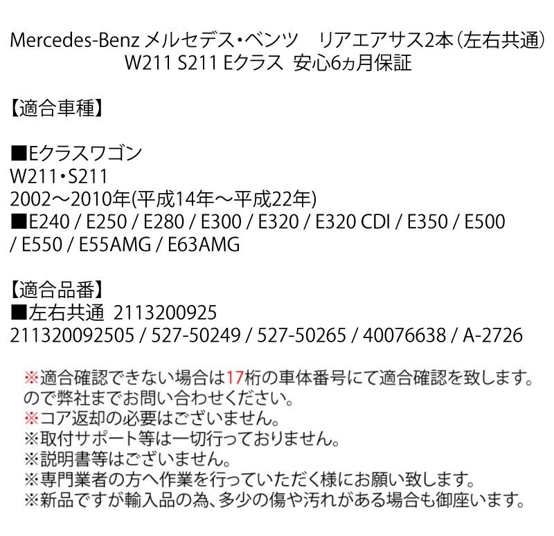 | 商品名 | メルセデス・ベンツ リアエアサス2本(左右共通)W211 S211 Eクラス 2113200925 安心6ヵ月保証 |