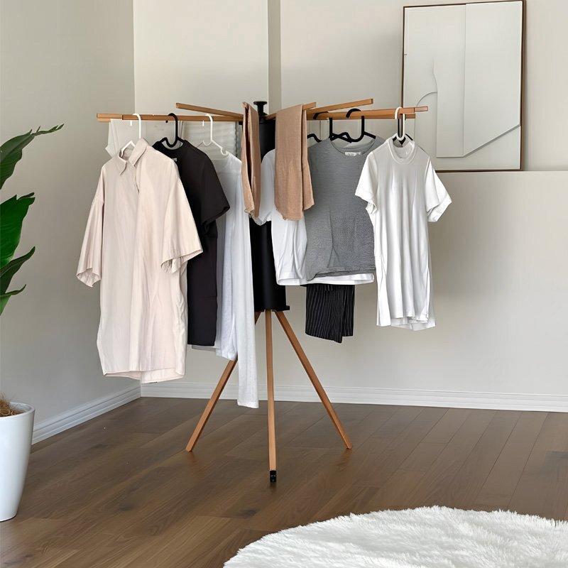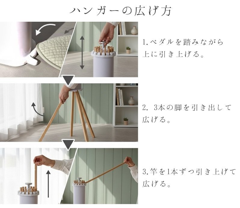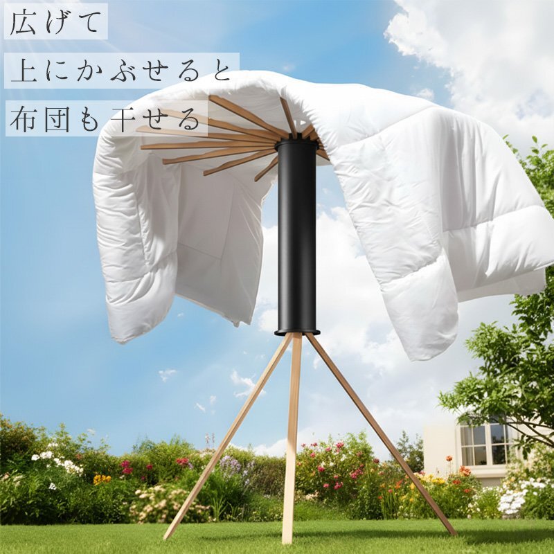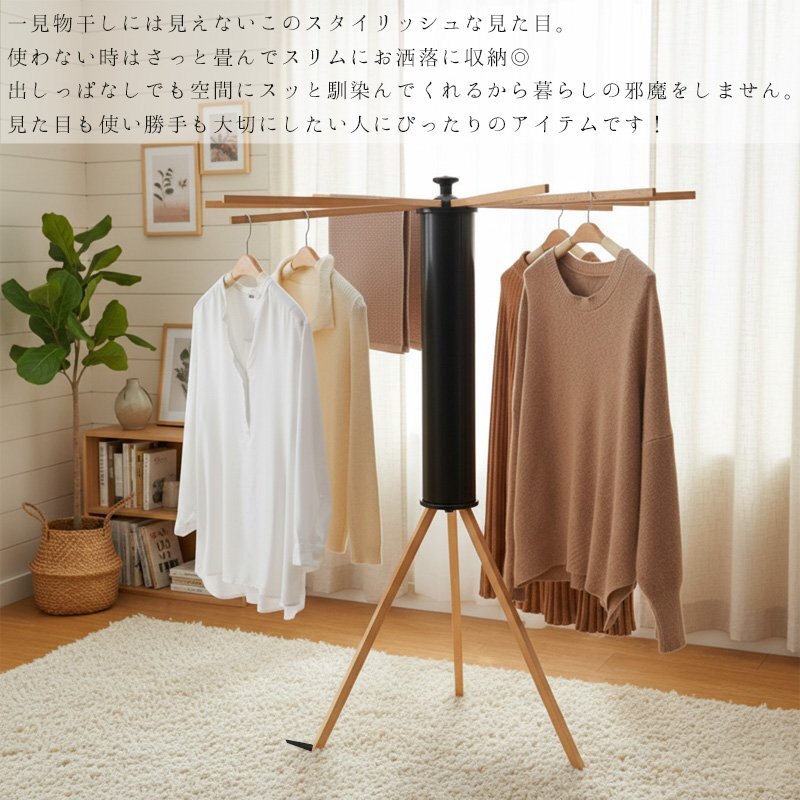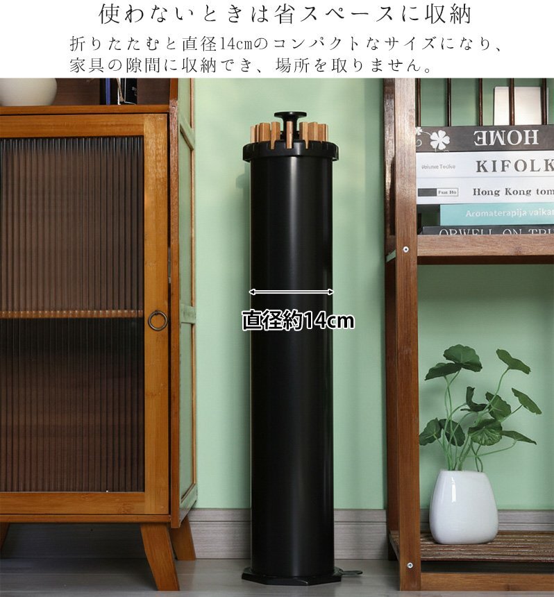 ![]() ■使う場所や洗濯物の量に合わせて形を変えられる 最大16本の物干し竿で大容量の洗濯物にも対応! 狭いスペースでも広いスペースでも、柔軟にサイズを調整でき、必要な分だけ竿を出して使えるので、無駄なく効率よくお洗濯ができます。 さらに、竿の数を減らしてコンパクトに使うことも可能で、家族の人数や場所に応じて使い方を変えることができます。 ■使わないときは省スペースに収納 使わないときは省スペースに収納。折りたたむと直径14cmのコンパクトなサイズになり、家具の隙間に収納でき、場所を取りません。狭い部屋でもスッキリ片付けられ、収納時に邪魔にならず、必要な時にサッと取り出してすぐに使えます。収納時も場所を取らないので、賢くスペースを活用できます。 ■広げて上にかぶせると布団も干せる 広げて上にかぶせると布団も干せるので、忙しい日常でも簡単に大きなアイテムを干すことができます。布団やシーツをしっかりと乾かせる広いスペースを確保でき、風通しが良いため、効率よく乾燥させることができます。 ■商品詳細 カラー:ブラック サイズ(約):展開時:高さ121cm、横幅110cm / 収納時:高さ70cm、横幅14cm 重量(約):2.8kg 素材:本体:プラスチック / 先端パーツ:アルミ / ハンガー:ブナ材 耐荷重(約):20kg |