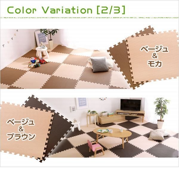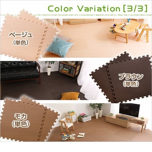 | 【カラー】 ベージュ、ベージュ&ブラウン、ベージュ&グリーン、ベージュ&モカ ベージュ&ピンク、ベージュ&イエロー、ブラウン、モカ 【サイズ】 外寸(1枚当たり):幅61cmx奥行き61cmx厚み1cm サイドパーツ付属時:幅62cmx奥行き62cmx厚み1cm 【重量】 3.9kg 【素材】 EVA樹脂 【梱包】 サイズ:62.5×62.5×17cm、重量:4.5kg 【ご注意】 サイズ、重量は概算です。 |