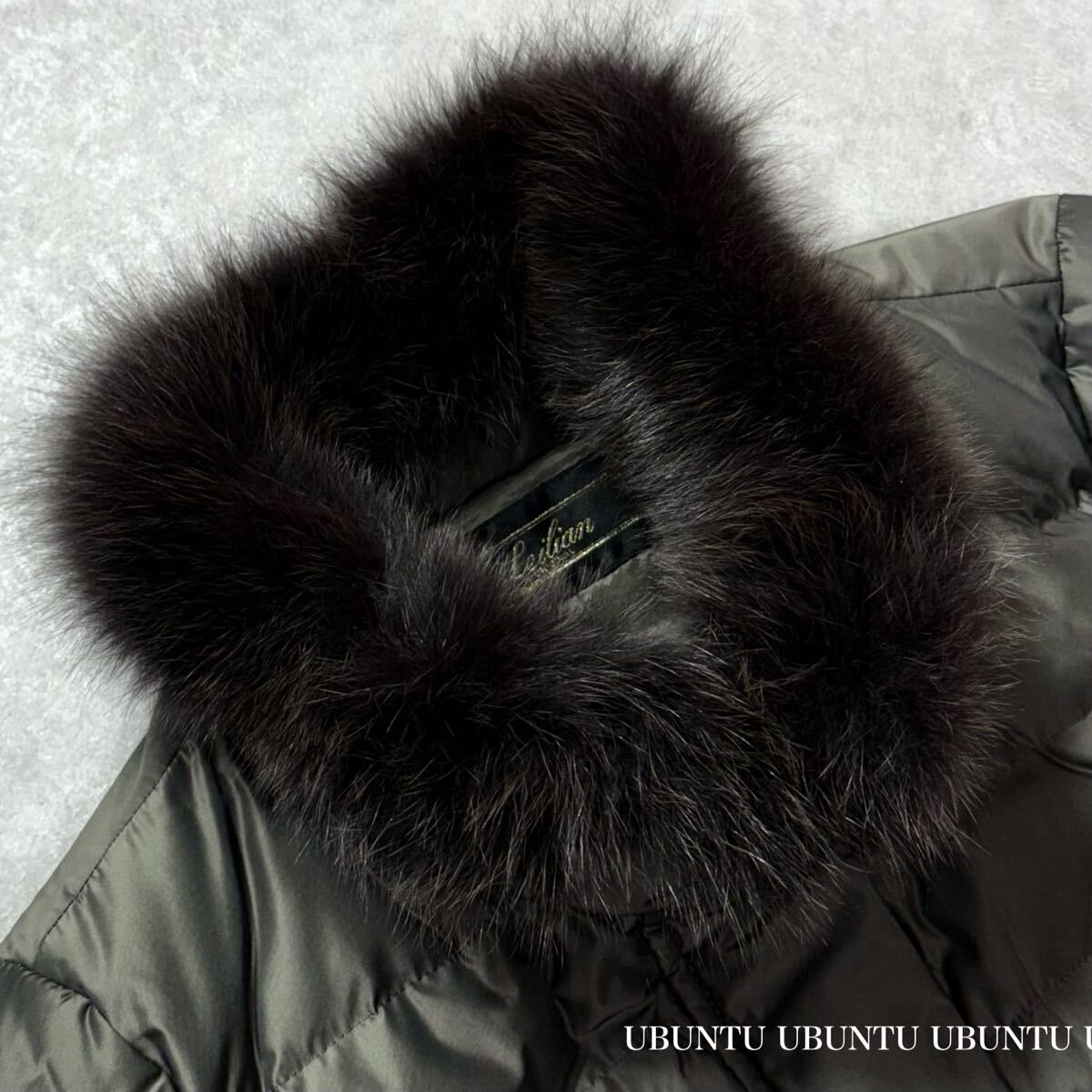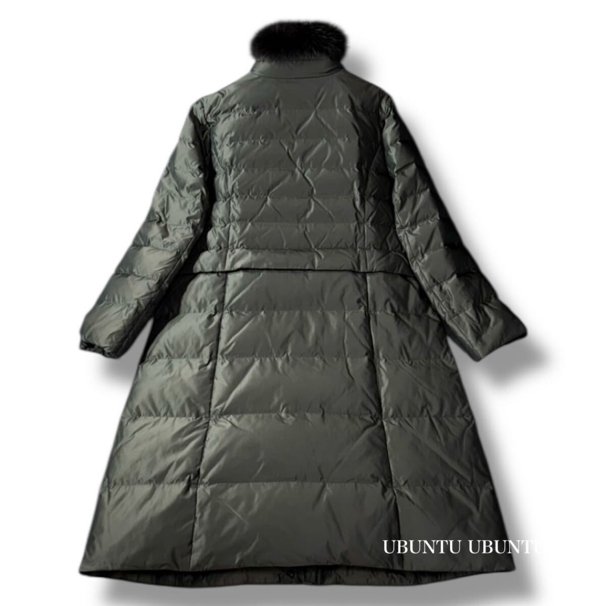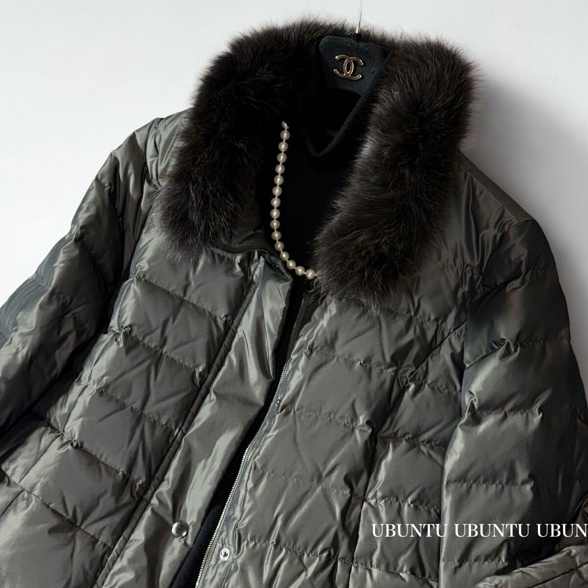 上品で落ち着いたトーンのくすみ系モスグリーンに、ふわっとリッチなフォックスファーが映える高級感あふれる一着。