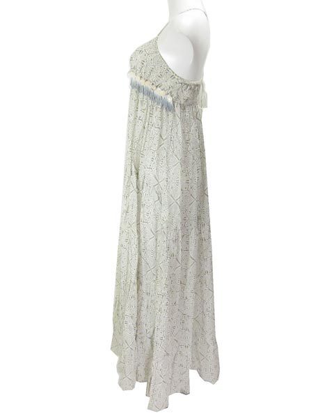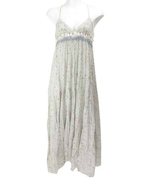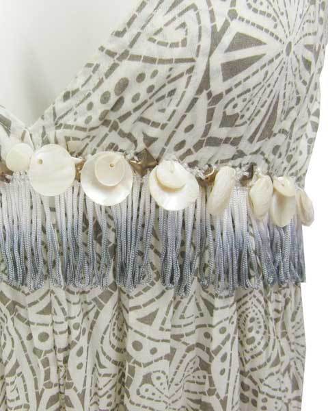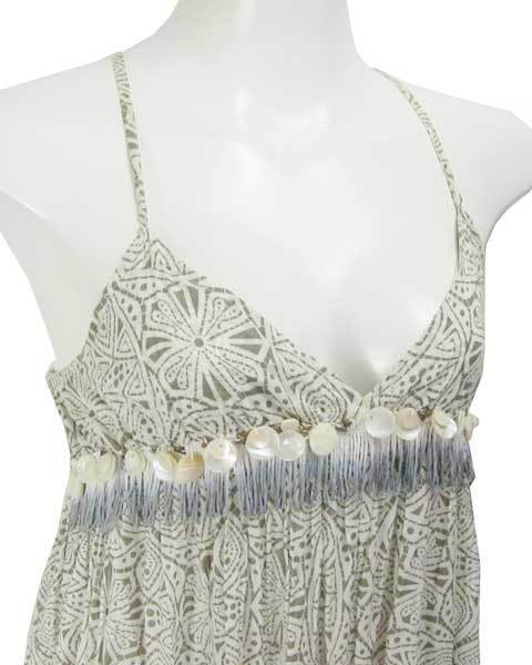 | 涼し気なコットンのキャミワンピース。薄手生地なのでやや透け感があります。重ね着でオシャレな着こなしが楽しめます。胸元にはフリンジやシェル風の飾りがついていてオシャレなデザインです。 |