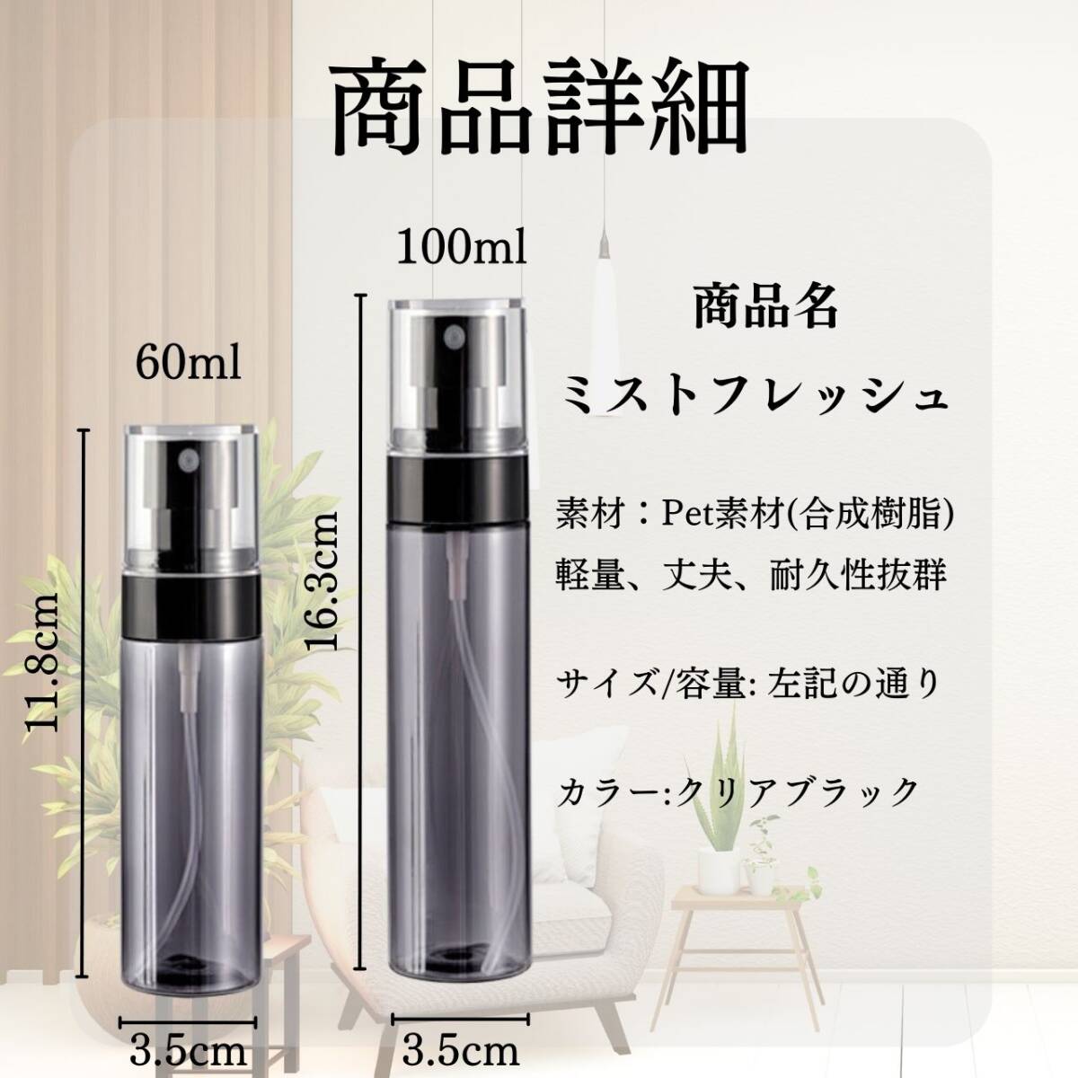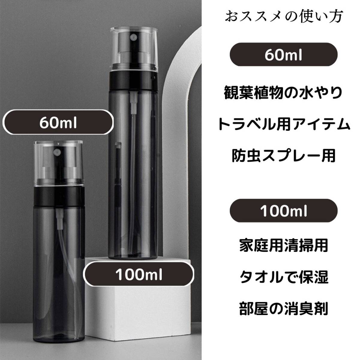 【便利!極細ミストスプレー】この携帯ミストスプレーボトルは、極細ミストが特徴的な、コンパクトで便利なアイテムです。【サイズ】60ml100mlの販売もございます。どちらも持ち運びに便利なコンパクトサイズです。【カラー】クリアブラックこのミストスプレーボトルは、消毒や清掃、観葉植物の水やり、保湿ケアなど、様々な用途に使えます。極細ミストで、均一に水分を振りかけることができ、細かな水滴が飛び散らずに、手軽に使うことができます。小さなポケットにも収まるので、持ち運びにも便利です。【注意事項】・海外製品のため多少の傷や汚れ等ある場合がございます。・送料の都合上箱なし、簡易包装での発送となります。コメントなしでの即購入OKです。おまとめ買いでお値引きさせていただきます。お気軽にコメントください。多機能スプレーボトル 美肌 化粧水 消臭 観葉植物 水やり 再利用 エコ おしゃれ デザイン インテリア自然成分 安心 アロマスプレー マルチ ライフスタイル スキンケア トラベル 旅行 持ち運び ミスト