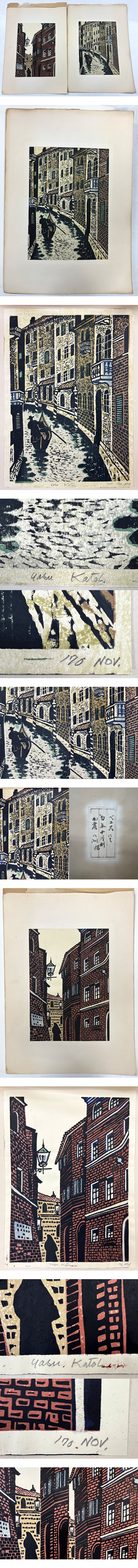 加藤 八洲 (かとう やす) 「木版画2点 ①ベニスにて ②ベルジュアにて」
