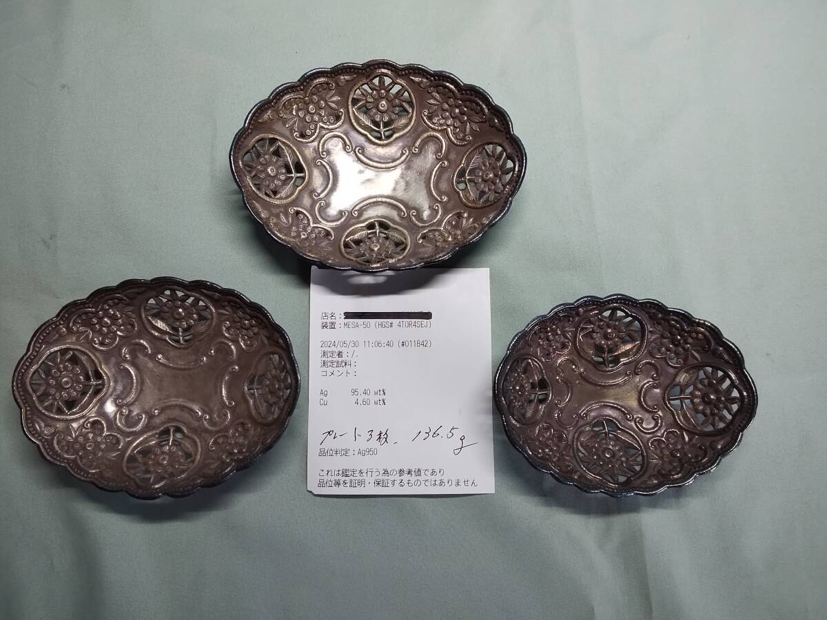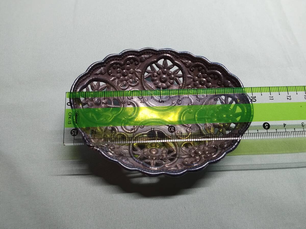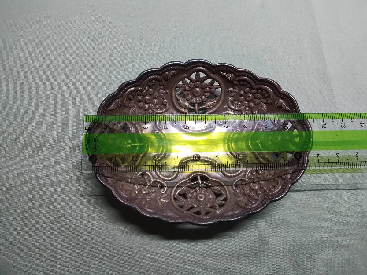 銀製の打ち出し輪花型細工製宝石置き皿、大,中,小,3点セットです。底裏に丸い四つ足が取付けて有り安定しております。| 出价者 | 信用 | 价格 | 时间 |