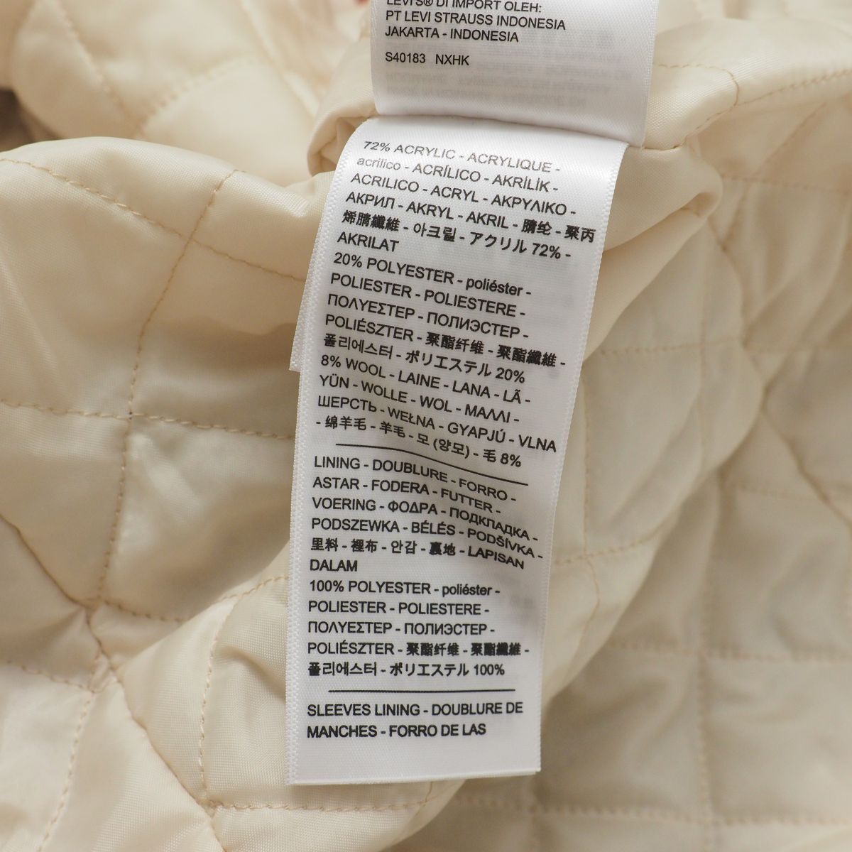 | 素材 | 表地:アクリル72%、ポリエステル20%、ウール8% 裏地:ポリエステル100% 中綿:ポリエステル100% |