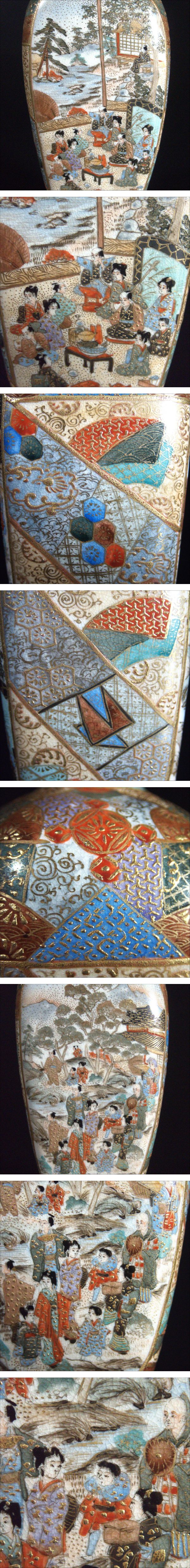 ■ 商品説明 明治薩摩らしい、細やかで丁寧な絵付けがしっかり楽しめる小瓶です。 人物の表情や着物の文様まで細かく描き込まれていて、見ていて飽きません。 形もすっきり洗練されていて、全体のバランスがとても綺麗。 色の重なりや金彩の発色も抜群で、光の当たり方によってほんのり雰囲気が変わるのも魅力です。 |