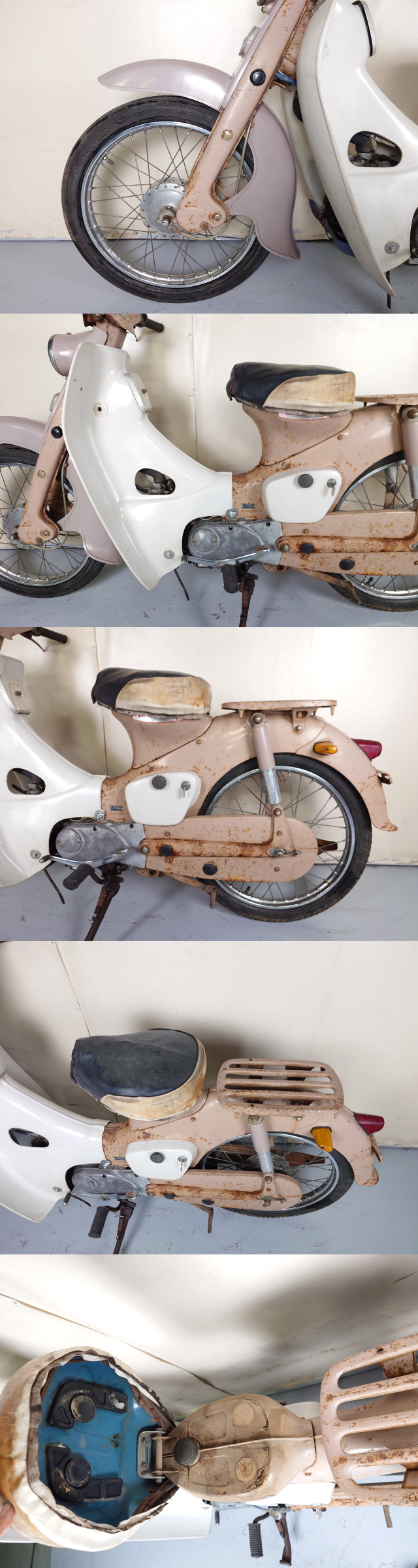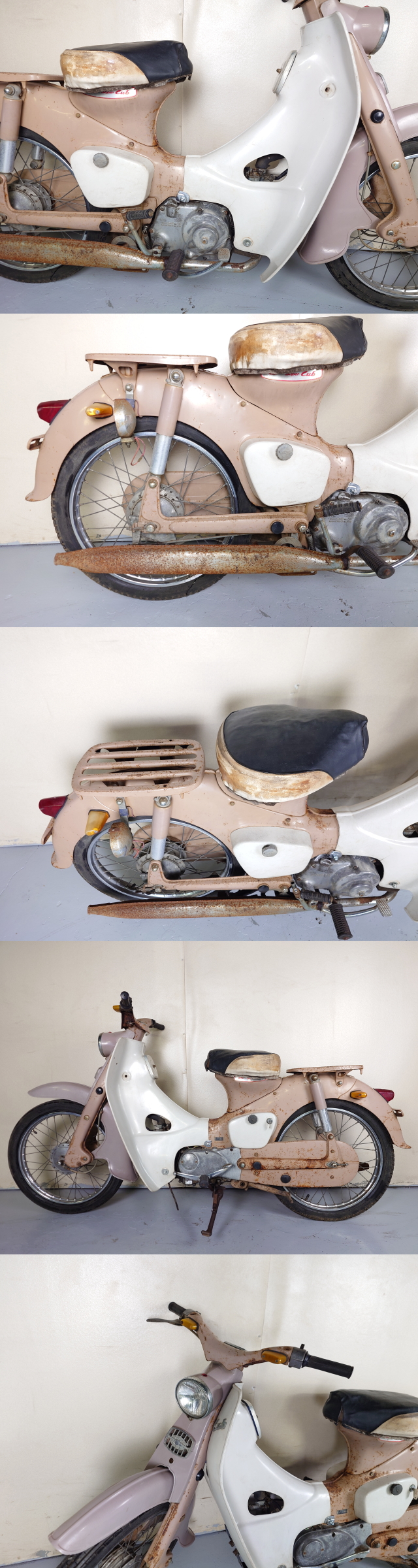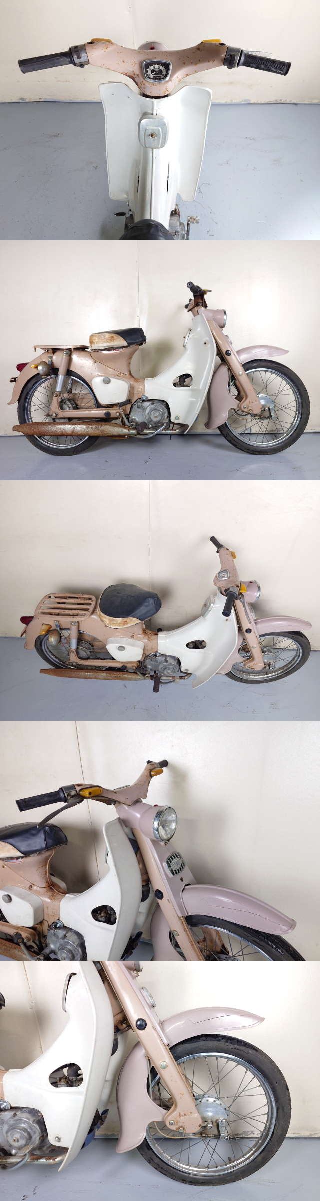 | ☆キックにて始動確認済みです。高回転まで吹けあがりました。 ☆タペット音(たぶん)あり、マフラー穴あきで排気音大きくなっています。 ☆構内での短距離、低速でのテスト走行ですが走る、曲がる、止まる、変速できました。 ☆キャブレターおよびコックから燃料滲みあります。 ☆書類付(販売証明書) ☆作製鍵1本あります。 ☆各所錆・傷・変色・破損・補習跡などあります。オリジナルでない箇所もあるかもしれません。 ☆画像の通りタンク内部変色などありますがひどいさびにはなっていません。 ☆バッテリーあがっています。 ☆右後ろウインカーは球切れしています。その他灯火類点灯しました。 ☆始動、走行はできましたが各所補修整備が必要なレストアベースとなります。 ☆センタースタンドは折れを補修してありますが長さがずれており現状自立難しいです。 ●車台番号:C100-A084*** ●走行距離:メーター画像をご確認ください。(交換履歴や一周しているかなどは基本的に不明です) 簡易的な走行チェックを行い、致命的な問題のなさそうな車両を出品しておりますが 本格的な整備、調整や細かいチェックまでは行っておりませんので 落札者様にて各所点検整備、必要に応じ消耗品交換や修理など行ってからご乗車してください。 テスト走行も短距離、短時間です。 外装の傷やヒビ、割れ、欠けなどは細かくは書き出しませんので 画像にて判断いただくかどうしても気になるようであれば現車確認してください。 特に年式の古い車両は各所経年劣化など発生していると思いますので 中古車両の現状販売ということご了承ください。 消耗品類(タイヤ、バルブ、オイル、フィルター類など)は基本的に現状のままで 点検、交換などしていませんのでそのまま使える場合もありますが交換前提でお願いします。 バッテリーあがりの車両はバッテリー交換後の乗車をお勧めします。 車種により故障の原因になる場合があります。 写真に写っていないものは一切付属しません。 上記の通り未整備未点検車両となり 帰宅途中でのトラブルなど発生しても対応できないため 自走での帰宅はすべてお断りさせていただきます。 積載可能な車両にて引取りに来てください。 埼玉県熊谷市からの出品です。 |