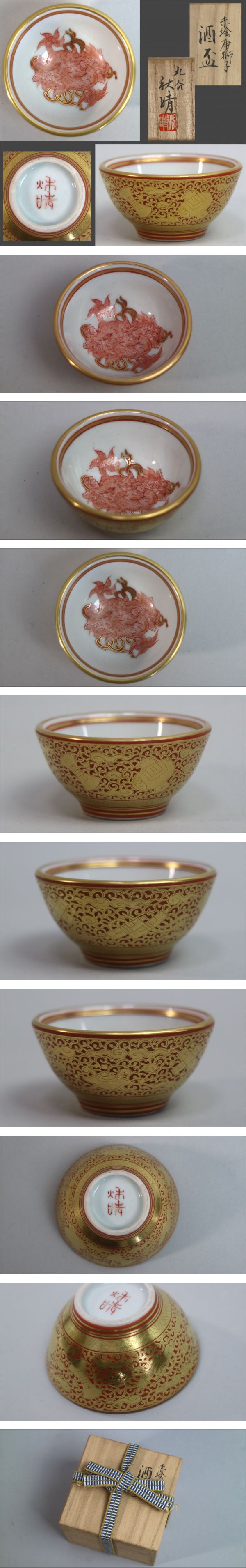 九谷焼 井上秋晴 赤絵金襴手 唐獅子図 酒盃 共布 共箱 略歴付き [浏览原始页面]
