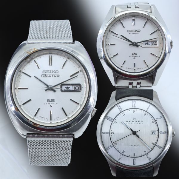 【腕時計】自動巻き★可動品★3点まとめ★SEIKO などです。 まとめ売りにつき、単品、一部売りはございません。 計3点 腕時計まとめ 稼働品 ◆SEIKO 5 ACTUS セイコーファイブアクタス 6106-7460 自動巻 デイデイト ケースサイズ(約):ヨコ3.7㎝ タテ3.7㎝ ◆SEIKO LM セイコーロードマチック 5606-7192 ケースサイズ(約):ヨコ3.7㎝ タテ3.5㎝ ◆SKAGEN スカーゲン 裏スケルトン 755XL SLCJ ケースサイズ(約):ヨコ4㎝ タテ4㎝ ※風防ガラスには小傷等あります。 ※ベルトはいずれも劣化、汚れ、部品の変形等あります。 ※画像をご確認の上ご検討をお願いします。 ※まとめ売りにつき、個別の詳細にはお答えしかねます。 長期保管品の為、古いものにご理解をいただいた上でのご入札をお願いいたします。 完璧な製品をお求めの方、 神経質な方のご入札はご遠慮ください。 画像でご判断いただける方のご入札をお願いいたします。 ※動作の可動は、ネジを巻いて秒針が動くのを確認したチェックです。 ※ 精度や動作保証はできませんので ご了承のうえご入札ください。(返品不可) 写真にある物が全てです。 土日は営業時間外ですのでご質問は平日にお願いします。 (返答可能時間 月~金曜日 10:00~17:00) |