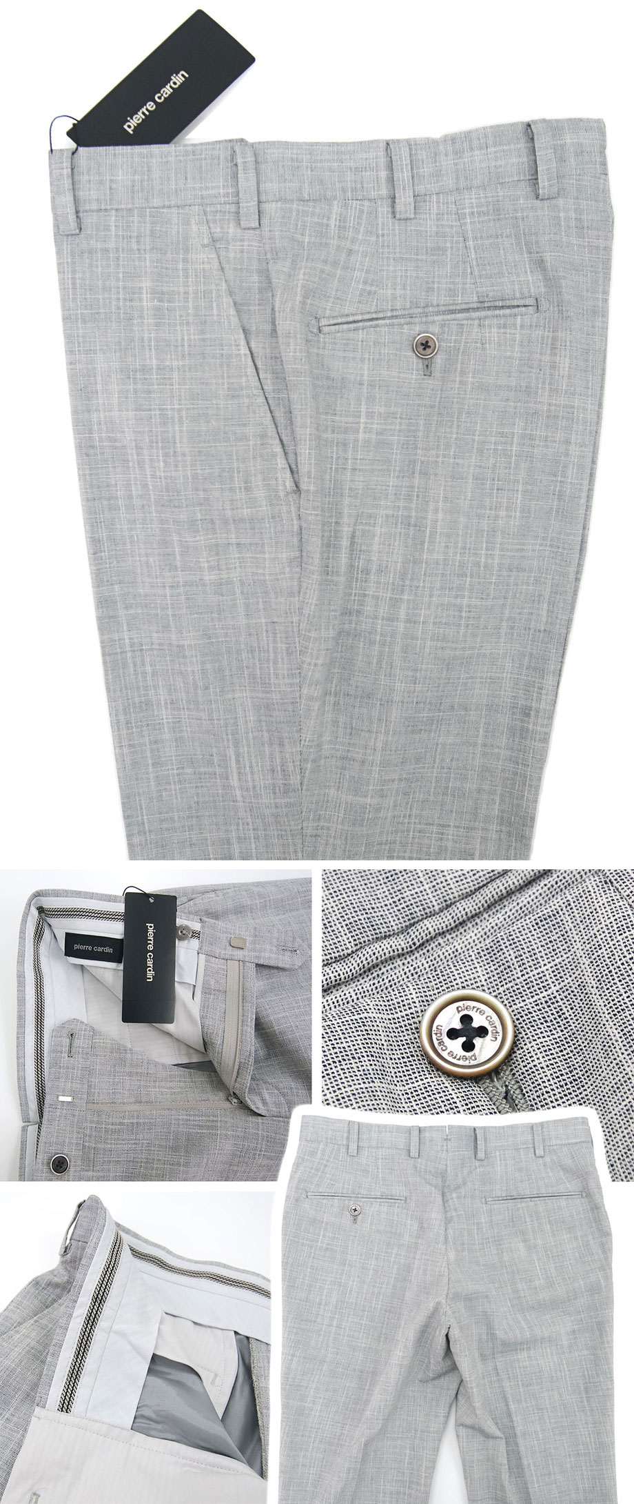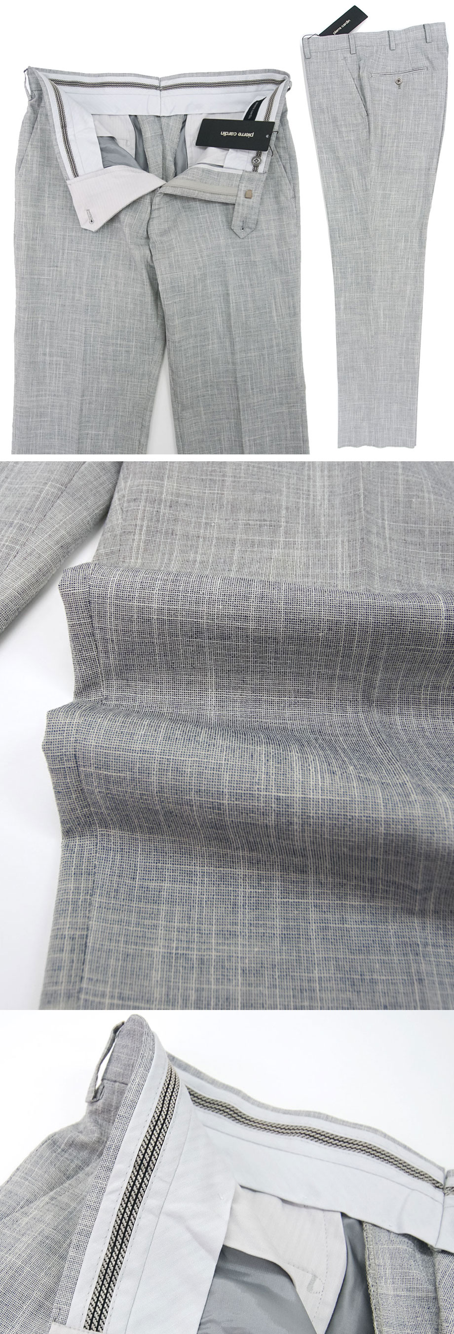 定価は税込44,000円の品。日本国内の百貨店で展開される国内正規品。希少な「日本製」で卓越した職人の手で仕上げられるピエールカルダンでもハイクラスのプレタポルテ ドレスパンツ(スラックス)。麻・ウール混紡の高級生地を贅沢に使用。強撚でサラリとした肌触りの春夏生地は通気・吸汗速乾に優れ、夏場にも快適。春夏~秋までご活用いただけます。入荷数はわずかですが、お安く出品できる機会をいただきましたので、思い切った価格で出品します。私どもの出品中のパンツの中でも特にお薦め。とても良い品で価値のおわかりになる方にご落札いただきたい品です。どうぞお見逃し無く。(※新品・未使用品ですが今回出品分には写真に写っているタグ(紙タグ)が付属しておりませんでしたのでご了承ください。)