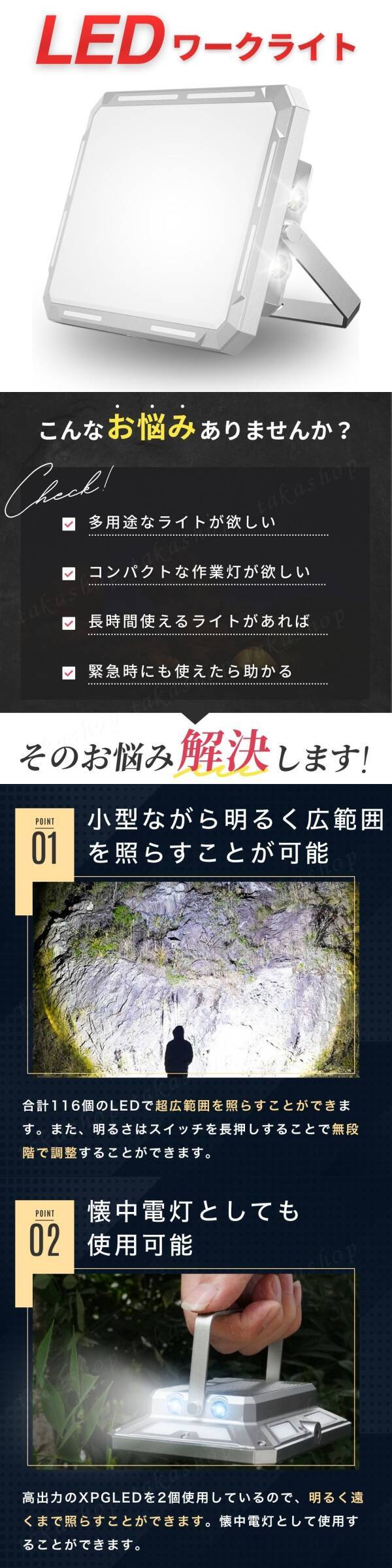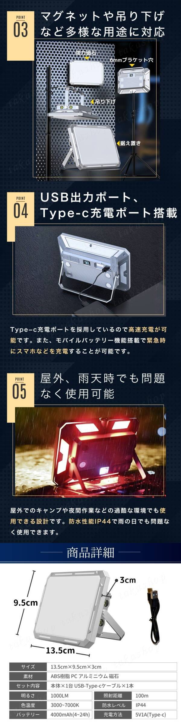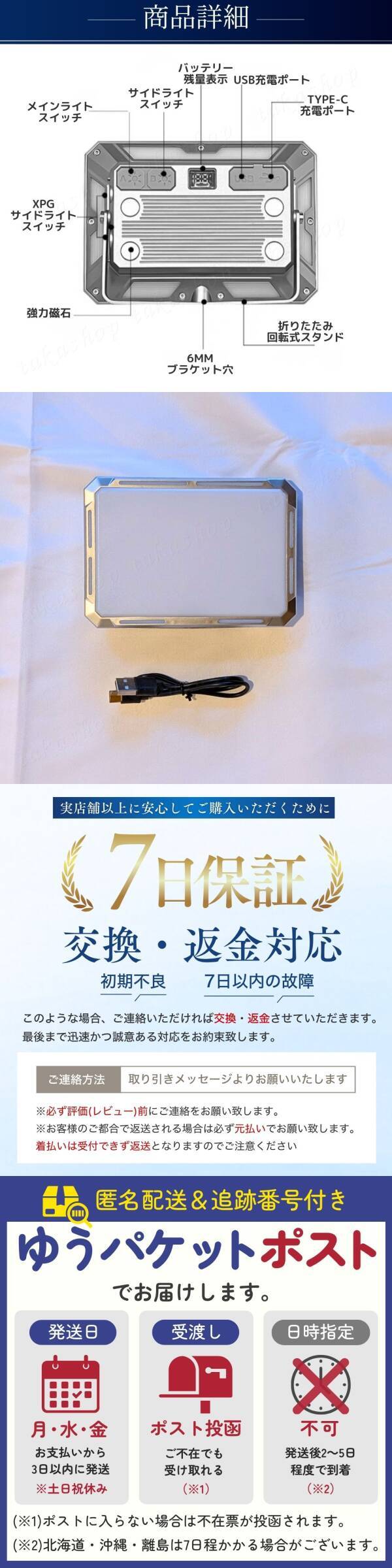 | 商品説明 | ご覧いただきありがとうございます。 ●商品説明 様々な用途で使用することのできる多機能な作業灯です。 懐中電灯にも常夜灯にも緊急時のSOSライトにも活用可能です。 USB-Type-cによる急速充電にも対応していて電池残量表示機能も搭載。 マグネット付きで鉄などにしっかり固定できる他、ブラケットは180度調節可能でランタンスタンドなどにぶら下げることも可能。また、6mmのネジ穴もあるので三脚に取り付けて使用することもできます。 ・小型ながら明るく広範囲を照らすことが可能 合計116個のLEDで超広範囲を照らすことができます。 また、明るさは無段階調整することができます。 ・懐中電灯として使用可能 高出力のXPGLEDを2個使用しているので明るく遠くまで照らすことがきます。 ・マグネットによる取付やブラケットによる吊り下げも可能 平面に置くだけでなく、マグネットによる金属への固定や6mmブラケット穴があるので三脚への取付、ブラケットによりランタンスタンドなどへの吊り下げも可能です。 ・USB出力ポート、Type-c充電ポート搭載 Type-c充電ポートを採用しているので急速充電が可能です。 また、モバイルバッテリー機能も搭載しているので緊急時はスマホなどの充電を行うことができます。 ・屋外、雨天時でも問題なく使用可能 防水性能IP44で雨の日や屋外での過酷な環境でも使用できる設計です。 ●商品詳細 サイズ:13.5cm×9.5cm×3cm 素材:ABS樹脂 PC アルミニウム 磁石 明るさ:1000lm 色温度:3000~7000K バッテリー容量:4000mh(4~24h) 照射距離:100m 防水レベル:IP44 充電方法:5V1A(Type-c) セット内容:本体×1個 USB-Type-cケーブル×1本 ※取付けに関するサポートは行っておりません。取付けに不安がある方は専門業者へご依頼するようお願いいたします。 ●発送について 【ゆうパケットポストminiで発送します】 発送日 :お支払い後1〜3日以内(平日) 到着目安:発送後2〜4日程度 ※遠方の方はもう少しかかる場合もございます 【配送方法の変更はできません】 ●お願い ・商品画像の転載や説明文のコピーはお止め下さい ※見つけたら通報しています ・ 海外製品のため、細かな汚れや傷がある場合があります。予めご了承ください ・即購入OK ・コメントなしOK 〇初期不良は対応しますので、何かあれば「評価前に」ご連絡下さい |