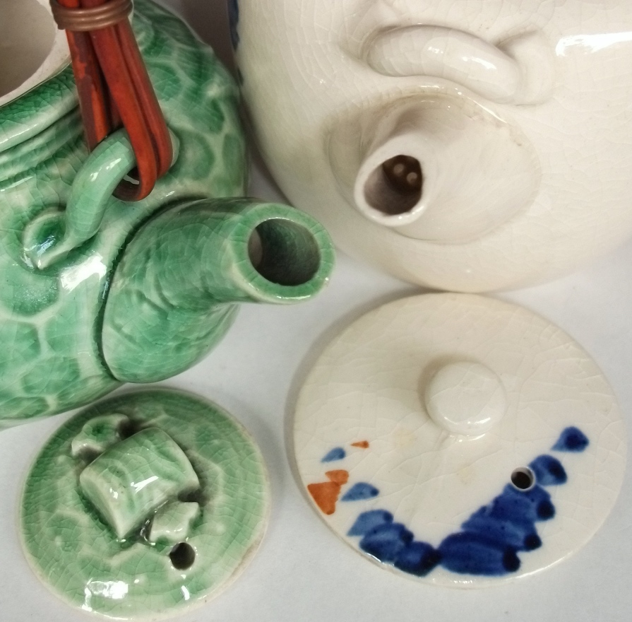 古い急須、画像の2点です。いずれも小ぶりです、お煎茶用かと思います。おおよその高さは緑のほうが約6.1cm、白いほうは約7.2cmです(いずれもフタ含まず)。時代詳細不明、戦前から戦後早い時期の茶道具類に混じっていました。緑釉/宝袋の形をした型物成形のほうには裏に「意匠登録」の針刻あり、この1点のみツルが付いていました。| 出价者 | 信用 | 价格 | 时间 |