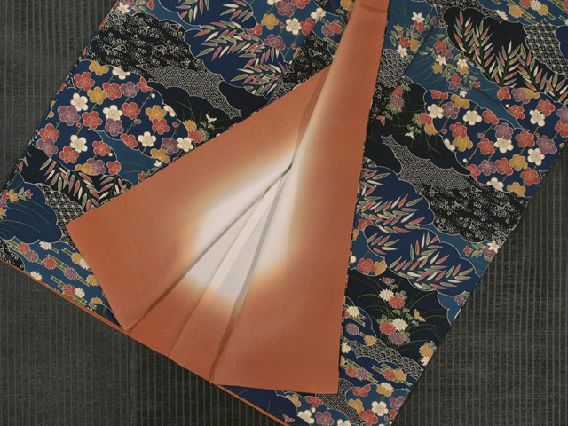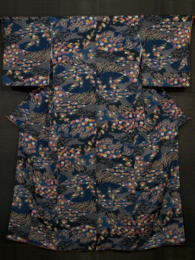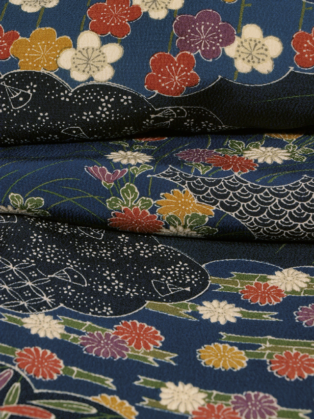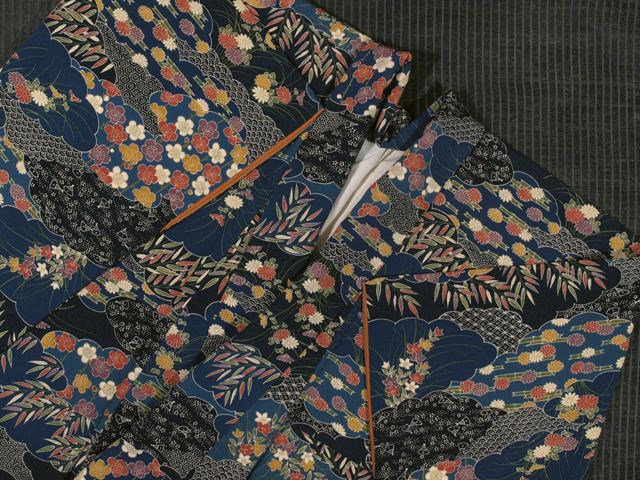 藍色、濃藍(こいあい)色、紺青(こんじょう)色の地に、草花や亀甲、七宝、扇などの小紋が配されている雲の文様が染められた縮緬の小紋です。袷仕立てです。 深みのある 3 種の藍色系の地色には格好良さが感じられ、彩り豊かな梅、菊、笹、竹、桔梗(ききょう)などの草花の沈んだお色目には、和色の美しさが堪能できます。 ユーズド品で、両前袖の袖口へり裏に若干のうすよごれがありますが、気にはなりません。お手入れいただくと、きれいになりそうです。そのほかに目につく大きなしみやよごれ、褪色などのダメージは見あたらず、きれいな状態です。 |