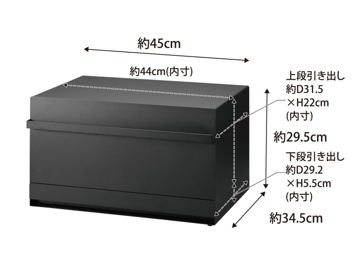 ブレッドケース 引き出し型2段 (ブラック) パンやお菓子などの食品からラップやキッチン小物まで収納ができる引き出し型のブレッドケース。 すっきりと収納ができる便利アイテムです。 上段引き出しは内寸高さが22cmなのでパンやスパイスボトルなども収納ができます。 下段引き出しにはラップやキッチンバサミなどのキッチン雑貨なども小物類が収納できる浅型タイプです。 【サイズ・素材など】 ■本体:幅450×奥行345×高さ295mm 約10.3kg ■上部引き出し内寸:幅440×奥行315×高さ220mm ■下部引き出し内寸:幅440×奥行292×高さ55mm ■スチール(粉体塗装) 【耐荷重】 天板:約6kg 上段引き出し(天板に物を置かない場合):約1.5kg 上段引き出し(天板に約500gの物を置いた場合):約2kg 下段引き出し:約1.5kg 【送料・その他】 ■送料無料(沖縄、離島は別途見積り) ■発送まで2.3営業日を頂いております。(土日祝は休業日です) 【その他・必ずご確認下さい。】 *お支払いいただく金額は落札金額+配送料金となります。 *商品の直接取引・送料着払いには対応しておりませんのでご了承ください。 *初期不良や運搬中の破損などは交換対応となります。 *商品が到着しましたら、不良、破損がないかご確認ください。 万一破損等ございましたら、3日以内にご連絡ください。お時間がたちますと、交換等できない場合がございます。 *当店の商品はすべて新品商品です。 *土日祝は休業の為、発送やご連絡ができません。 よろしくお願いします。 |