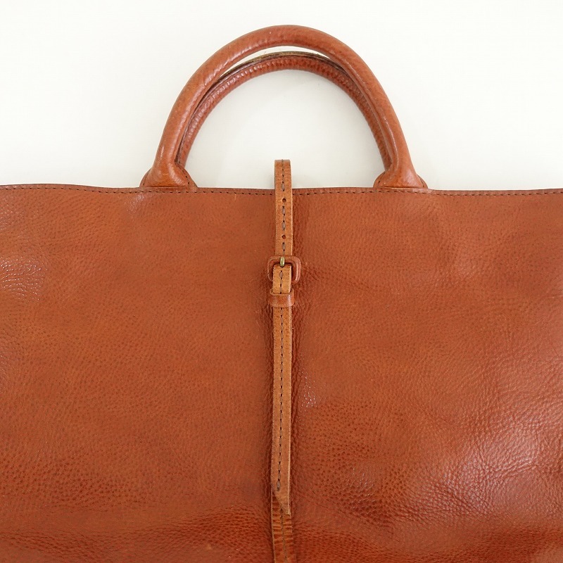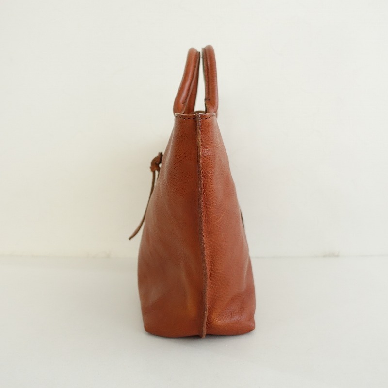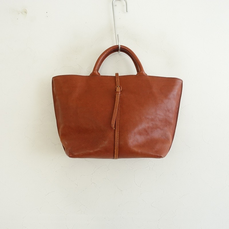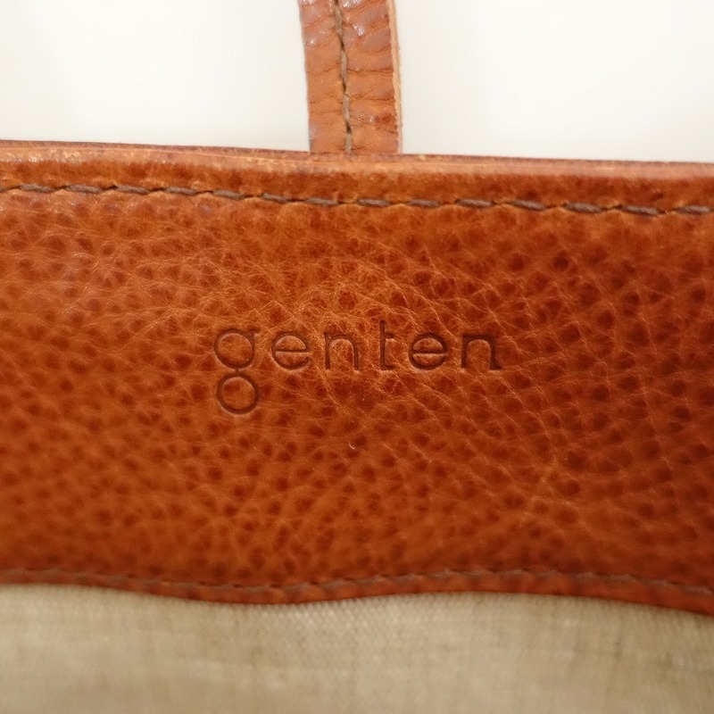| gentenのレザートートバッグです。カラーはブラウンで素材はレザー、開口部はベルト留めです。内側にはナチュラルベージュの裏地&オープンポケットが3つございます。 |