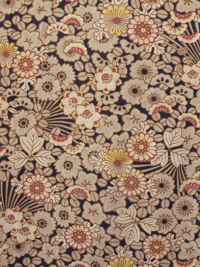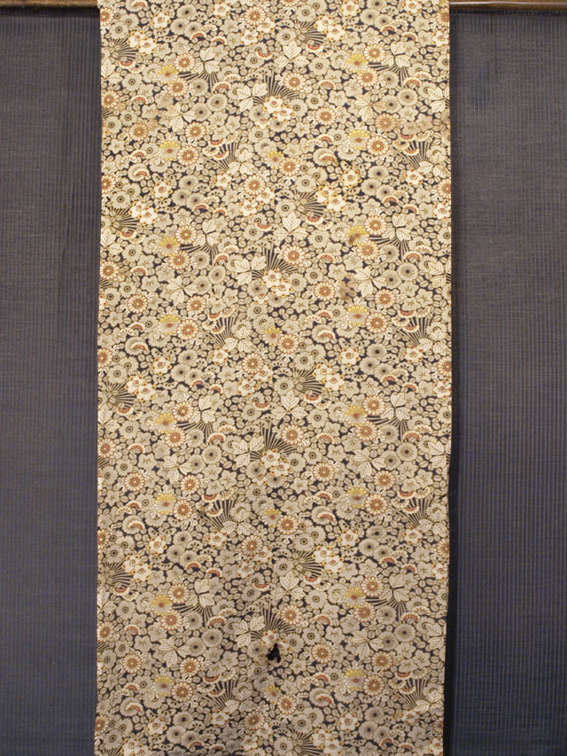 黒紅色の地に、桜や撫子(なでしこ)、桔梗(ききょう)、萩、菊などの草花の文様が染められている、綿の和更紗のはぎれです。 昭和初期ごろにつくられたと思われるアンティークのお品です。さらりとした手ざわりの綿地です。 画像のとおり、下端から約 26cm の中央に直径約 6cm の穴が 1 か所、約 57cm の右耳に長さ約 4cm の裂けが 1 か所あります。また、全体のところどころに直径約 1-5mm の小穴が数か所あるほか、上端から約 60-75cm の範囲で中央右に直径約 3-5cm のよごれが 2 か所あります。全体のところどころにこまかなうすよごれがちらほらとありますが、そのほかに目につく大きなダメージはありません。生地の力もあります。※風楽の出品内で同じ柄のものを複数出品している場合もあります。 |