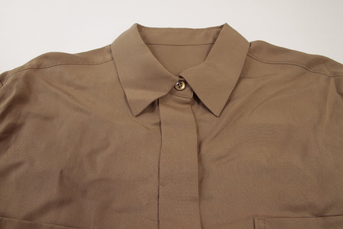 サイズ:F 身幅:56 着丈:68 肩幅:46 袖丈:57 単位㎝(平置き採寸) カラー:カーキ 素材:セルロース100% 参考価格:約20,900円(税込み) コンディション:N タグ付き ミリタリーなテイストを上品に落とし込んだダブルポケットシャツ。ドレープ性と適度なハリ感を兼ね備えたセルロース素材。さらりと1枚ではもちろん、羽織りとしても活躍する1枚。 |